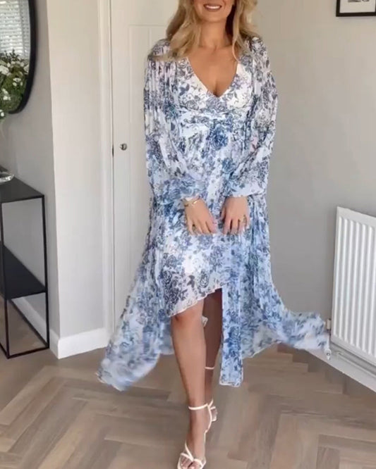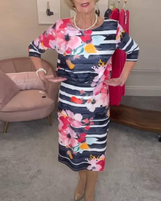 Elegant kortermet kjole med rund hals med blomstertrykk