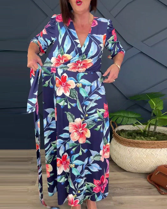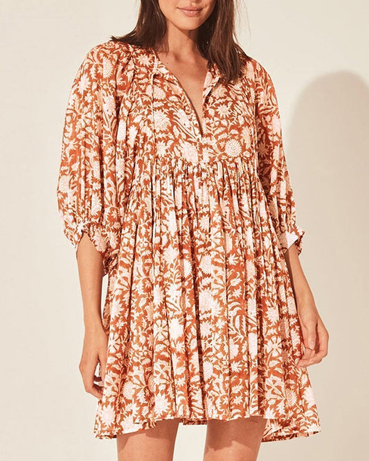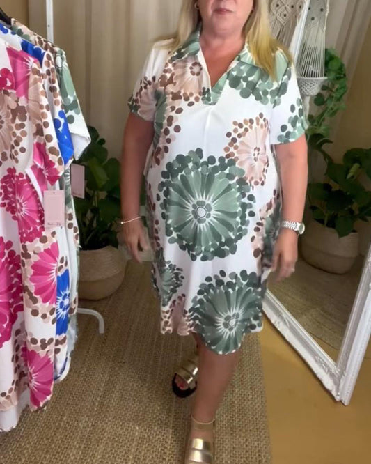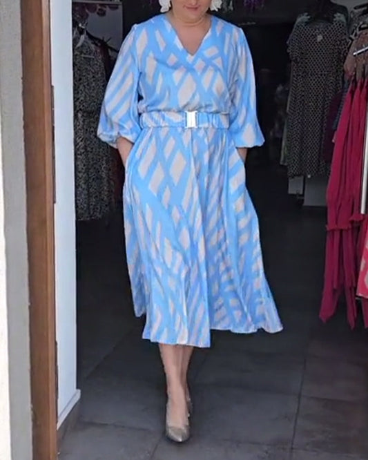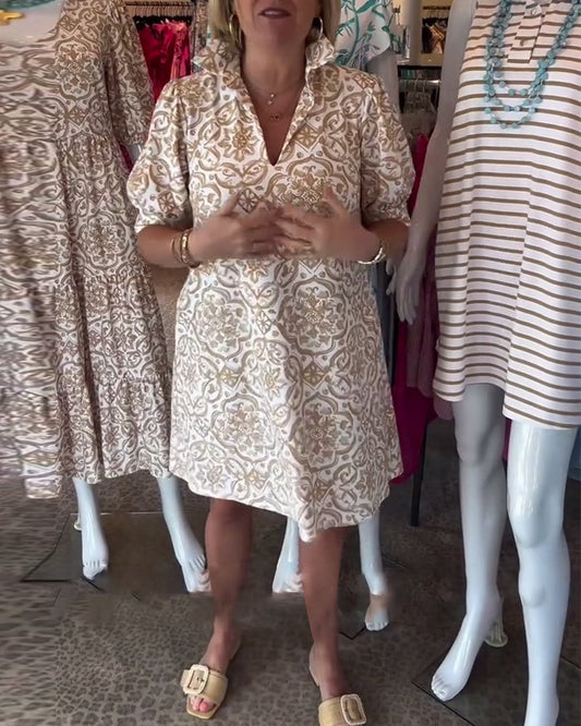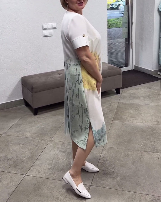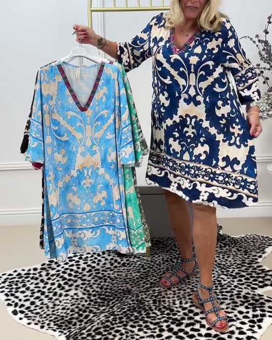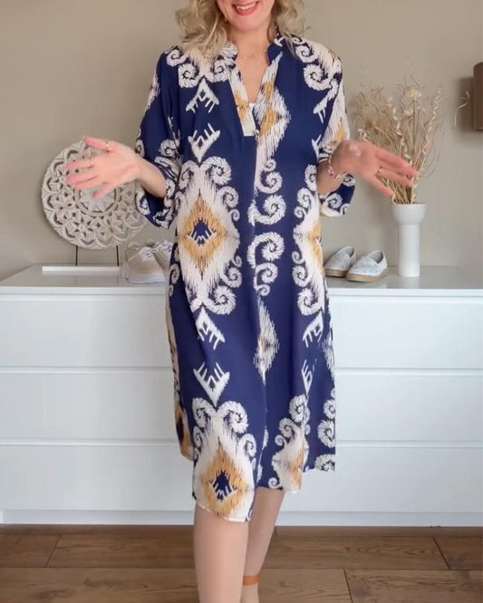 Uformell trykt V-hals trekvart ermer løs kjole