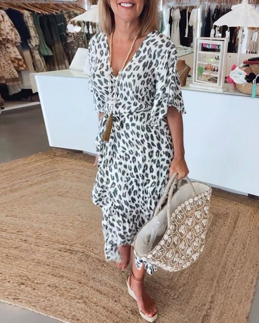 V-hals elegant kjole med leopardmønster
