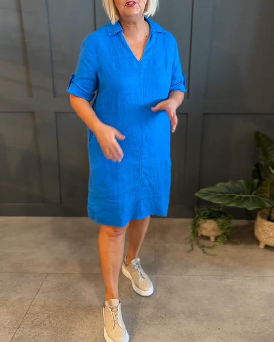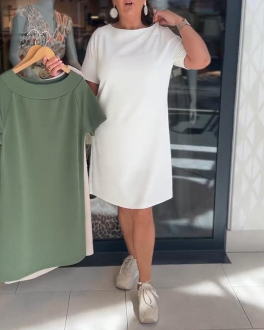 Uformell ensfarget kortermet kjole med V-hals