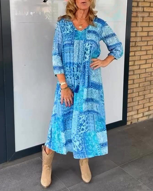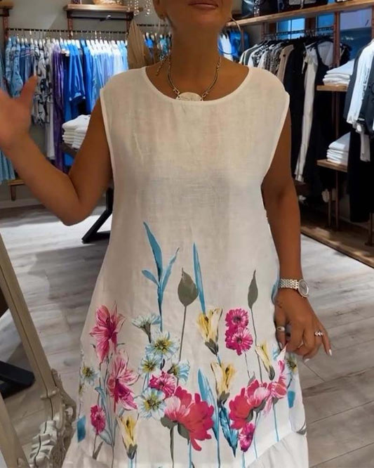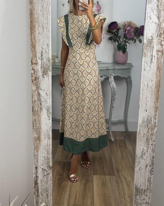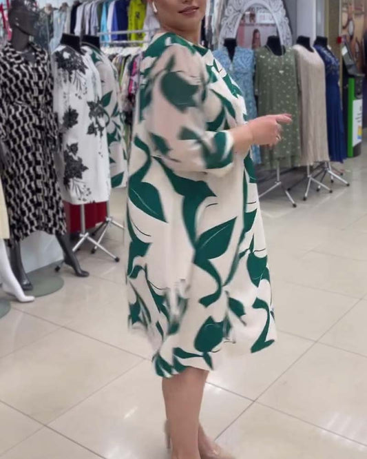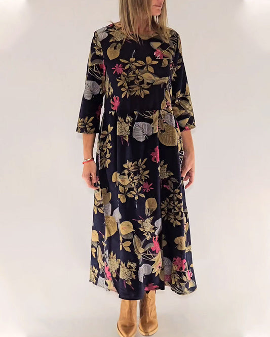 Elegant kjole med rund hals med blomster- og bladtrykk