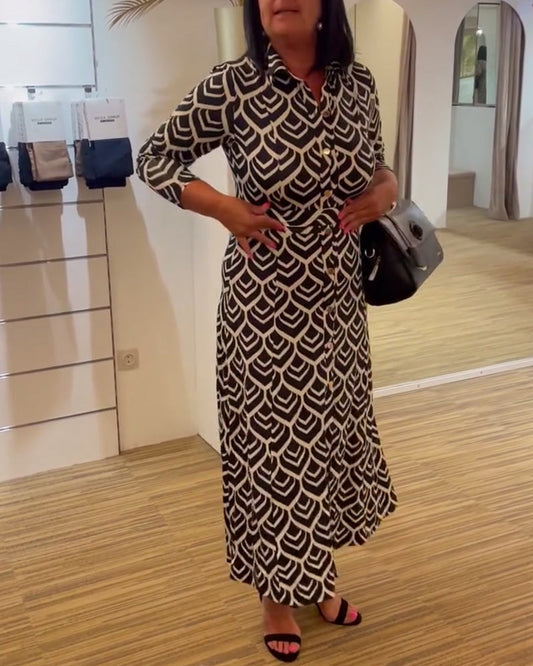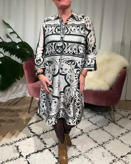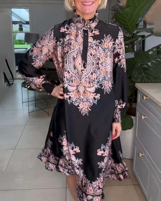 Elegant kjole med turtleneck-knapper med vintage trykk