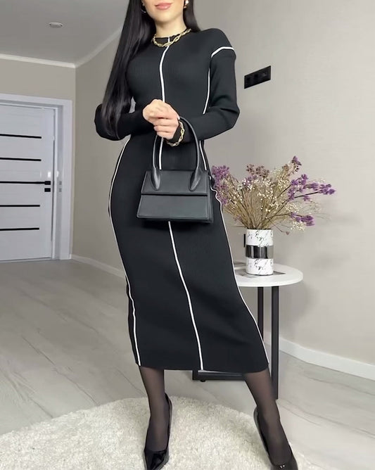 Fashionable stand collar long sleeve patchwork slim fit sweater dress