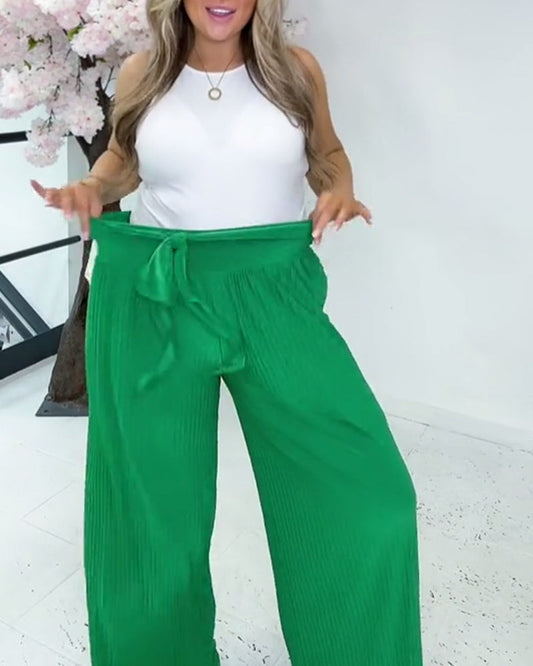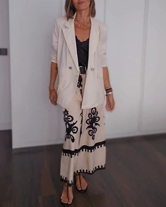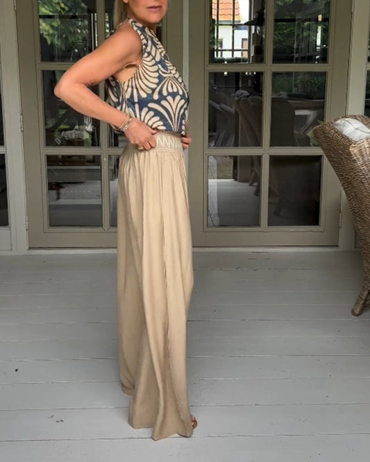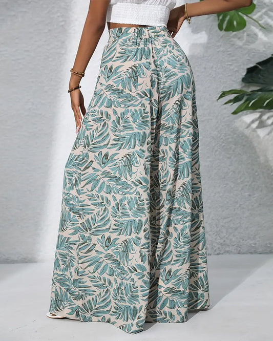 Elegante bukser med vidde ben med høy midje og bladtrykk