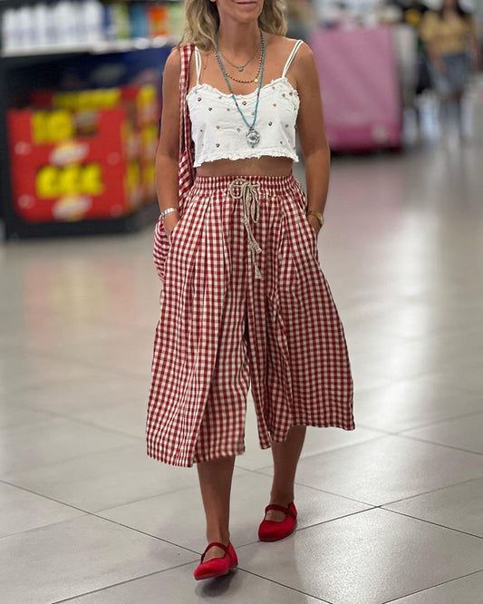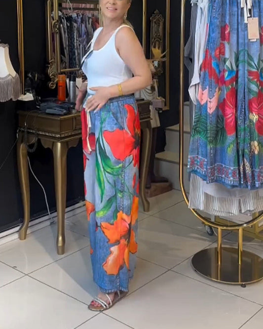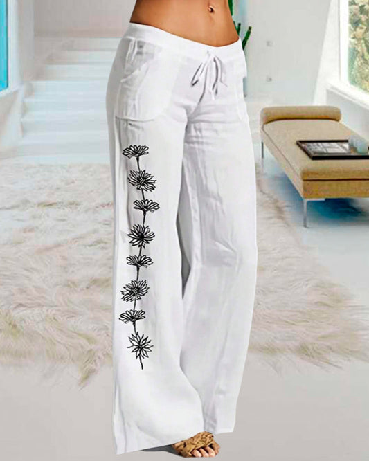 Uformelle bukser med brede ben og snøring med blomstertrykk