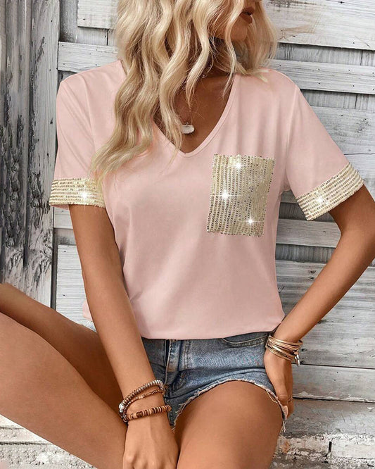 V-Neck Casual Sequined Short-Sleeved T-Shirt