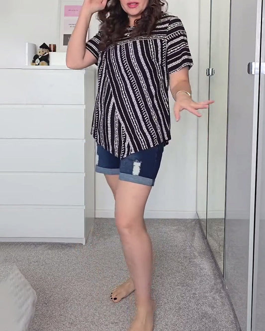 V-Neck Hollow Print Short-Sleeved T-Shirt