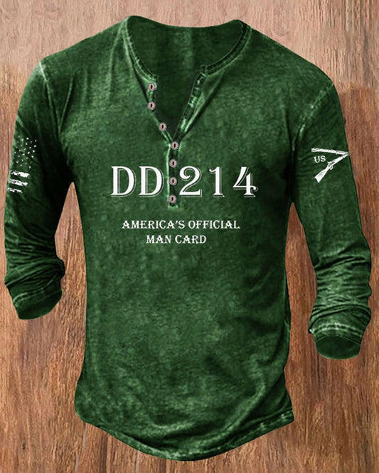 Men's DD214 America's Official Man Card Printed Casual Henley T-Shirt