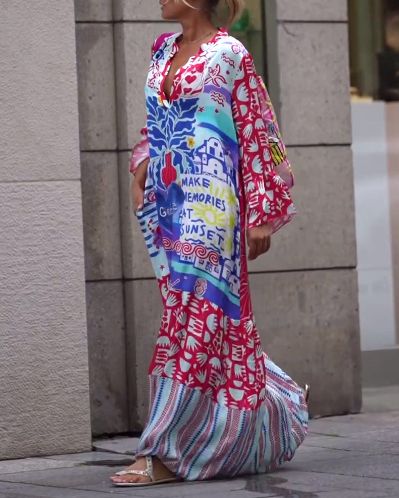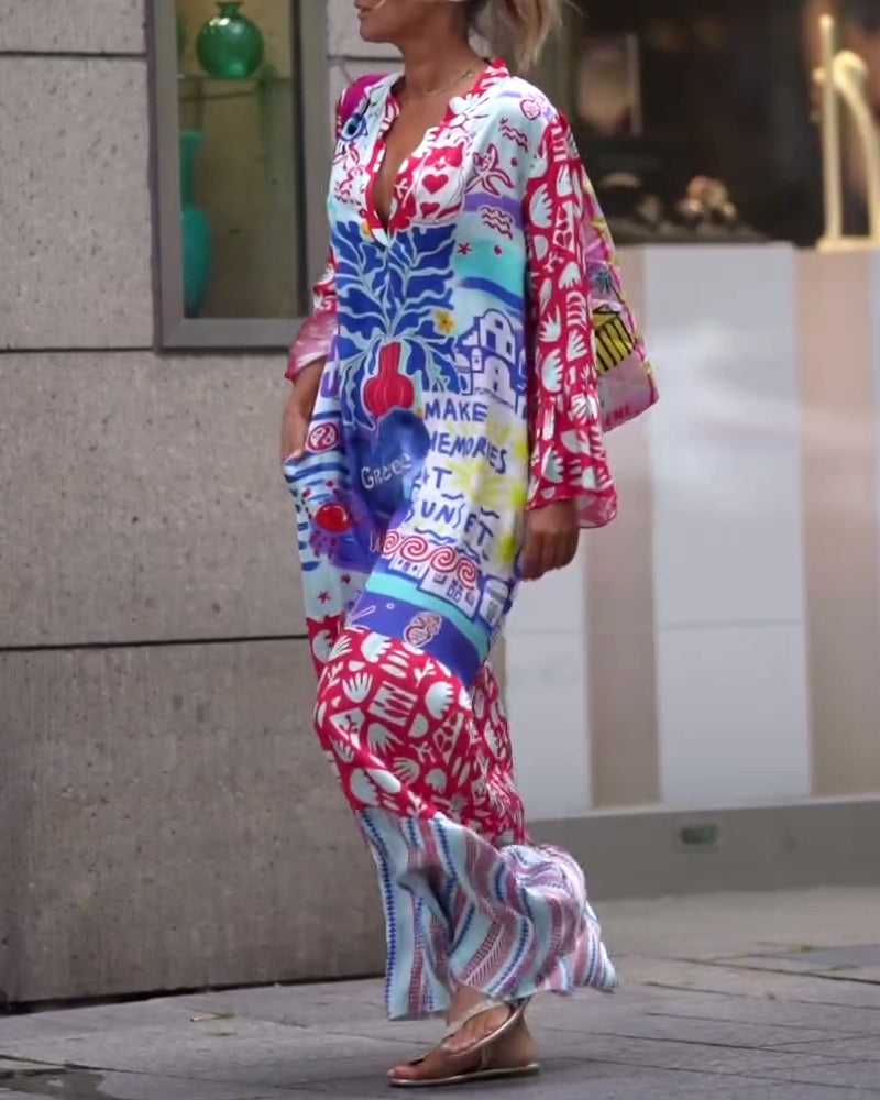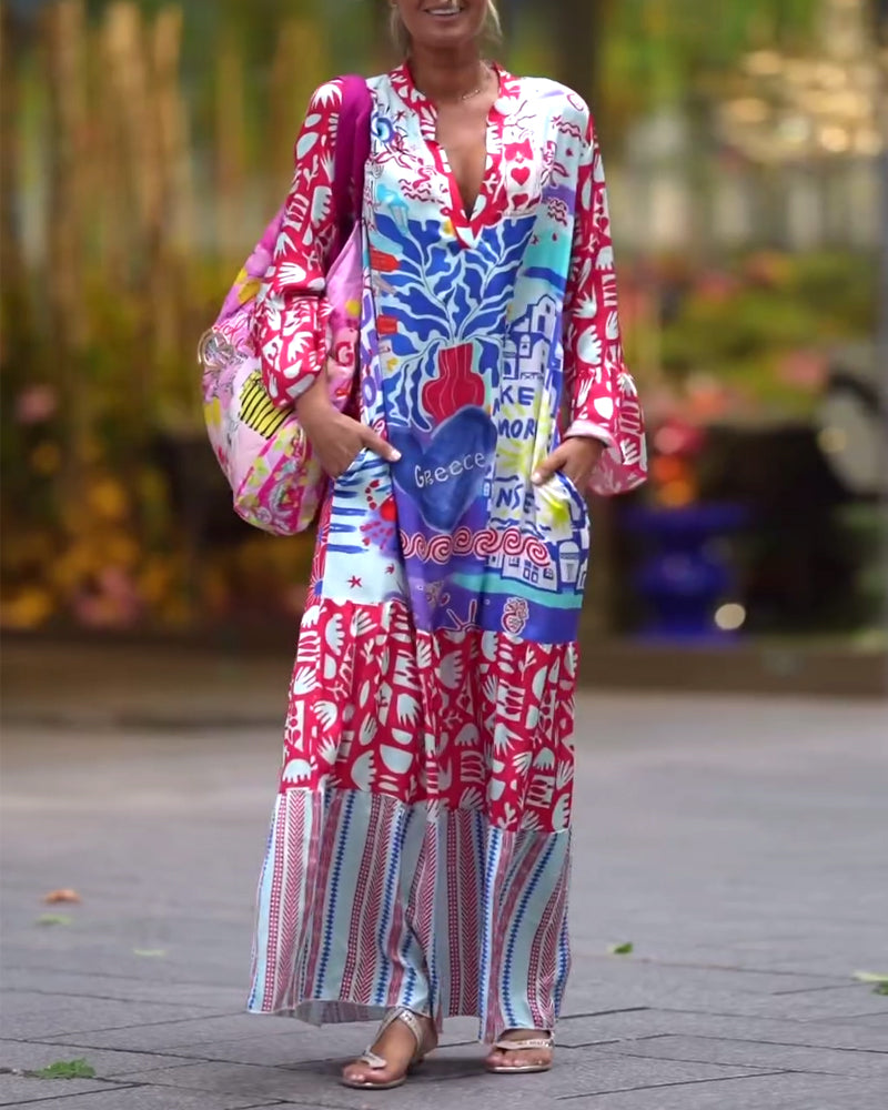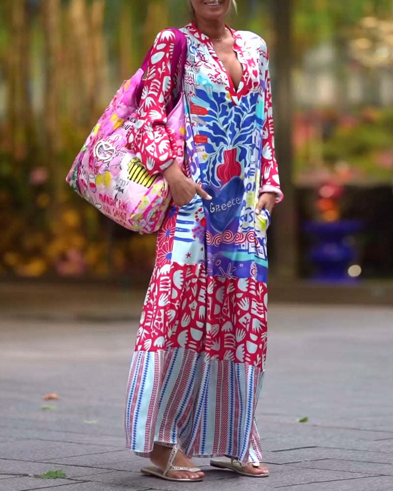 Uformell lang kjole med skjøtetrykt dyp v-lomme