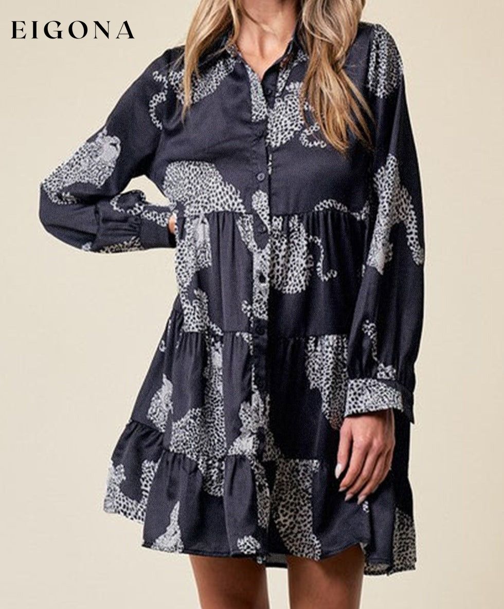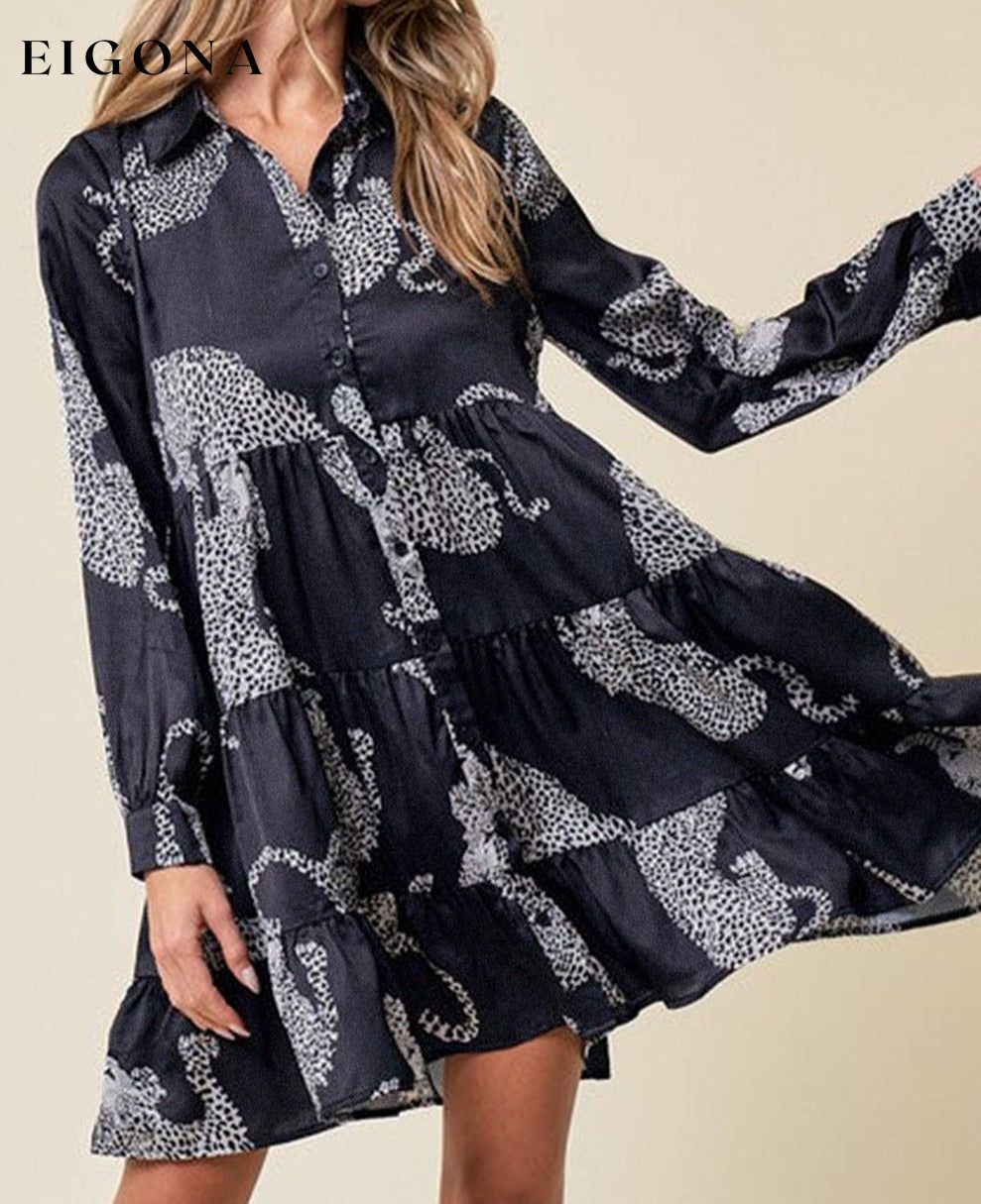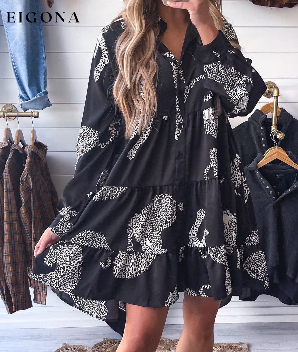 Black Leopard Print Button-up Long Sleeve Casual Dress