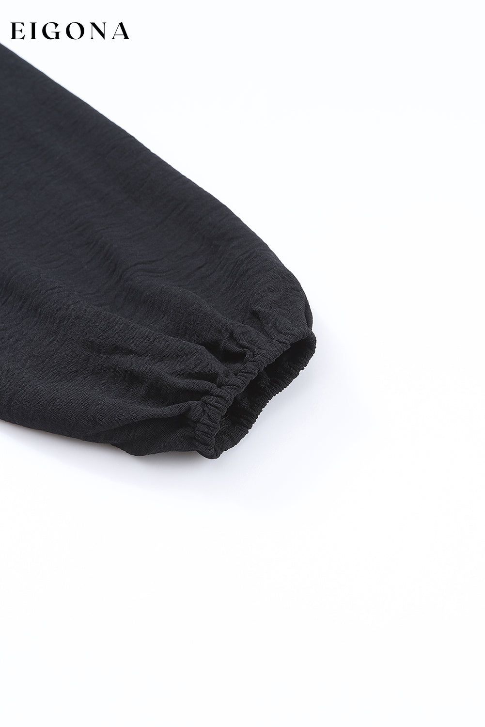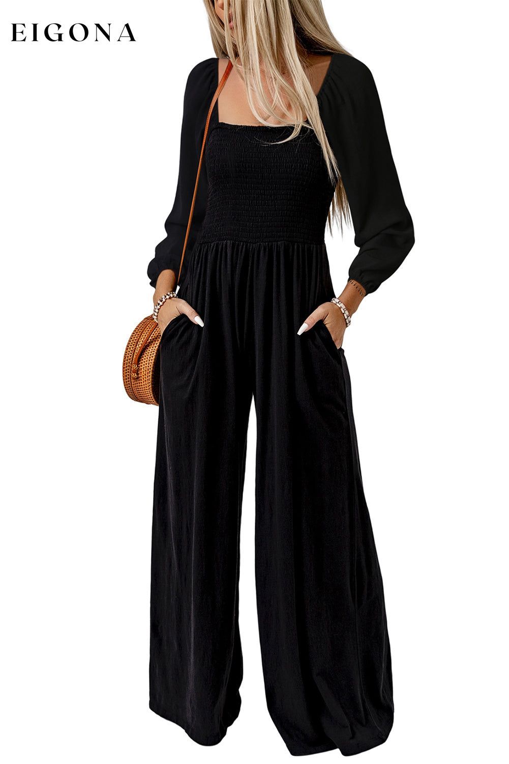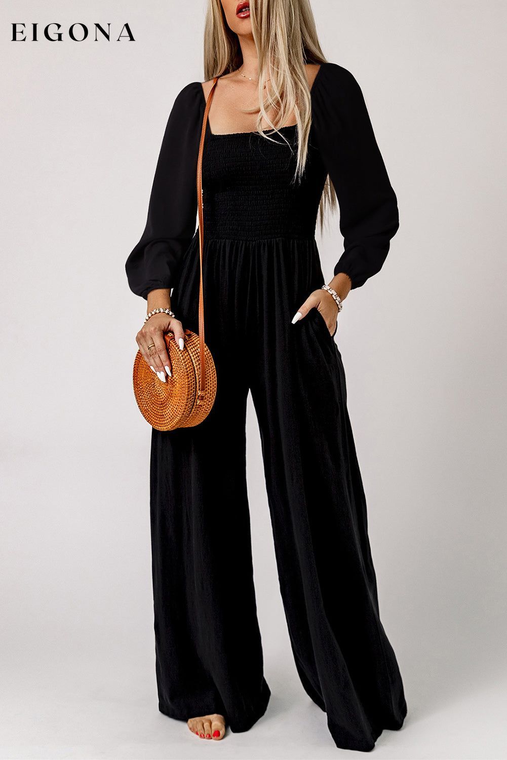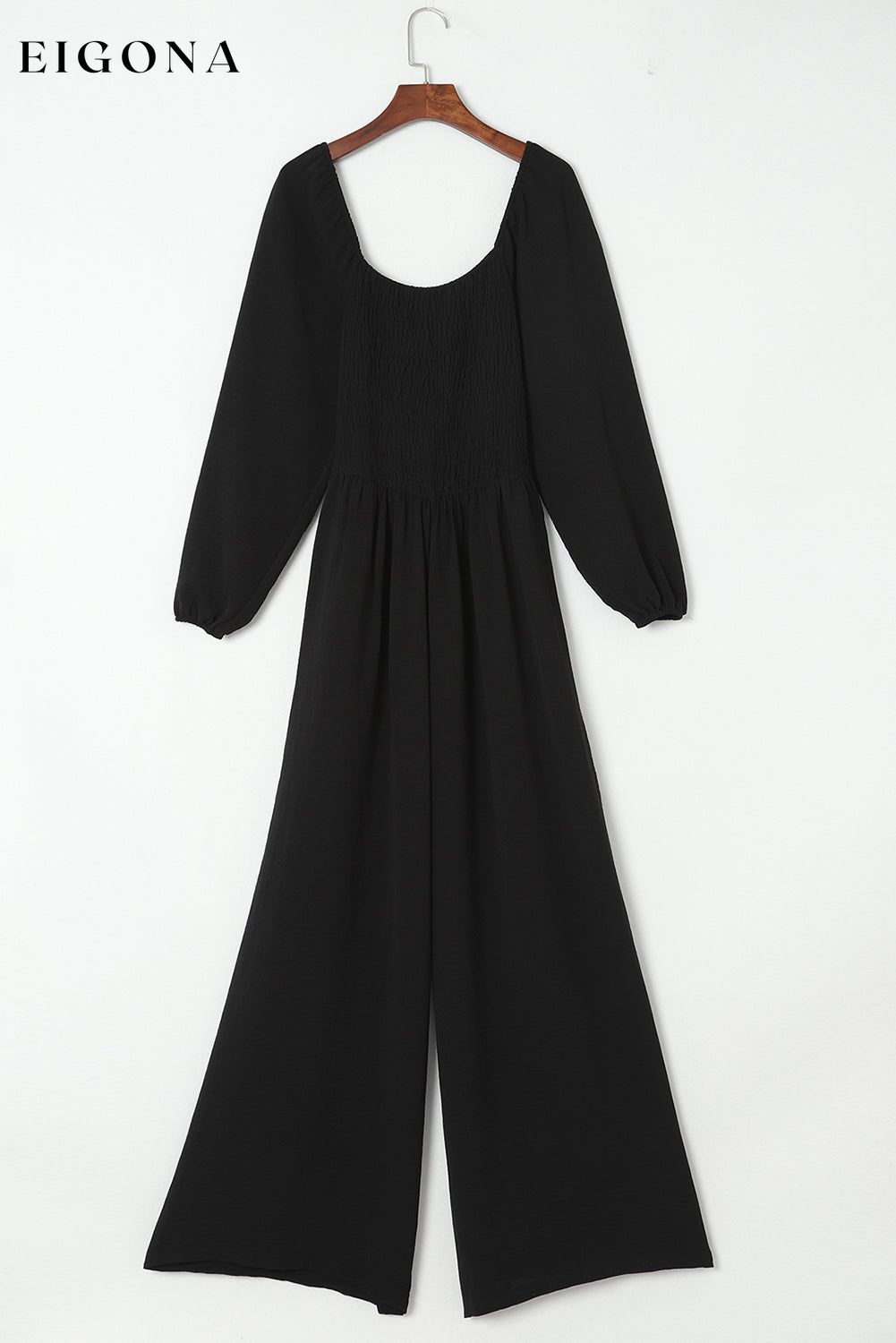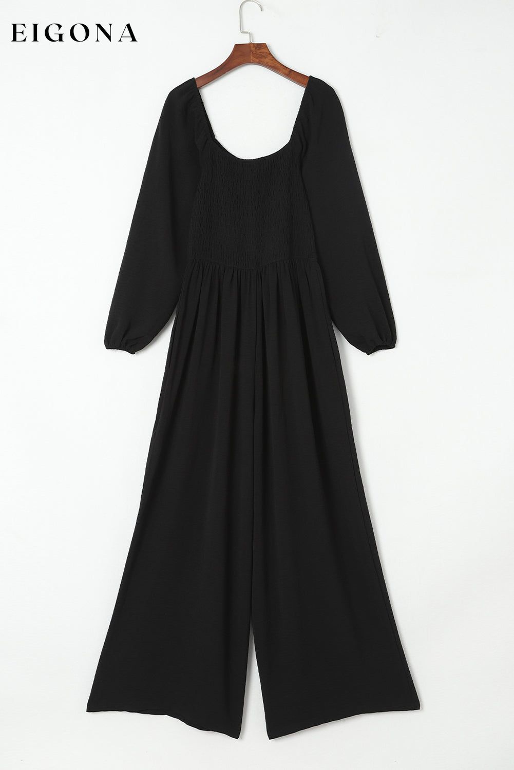 Black Smocked Square Neck Long Sleeve Wide Leg Jumpsuit