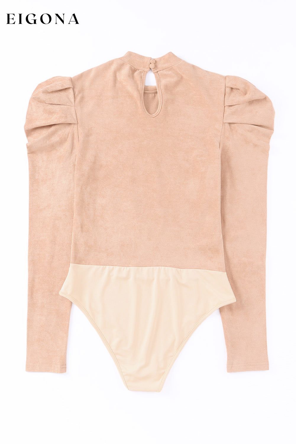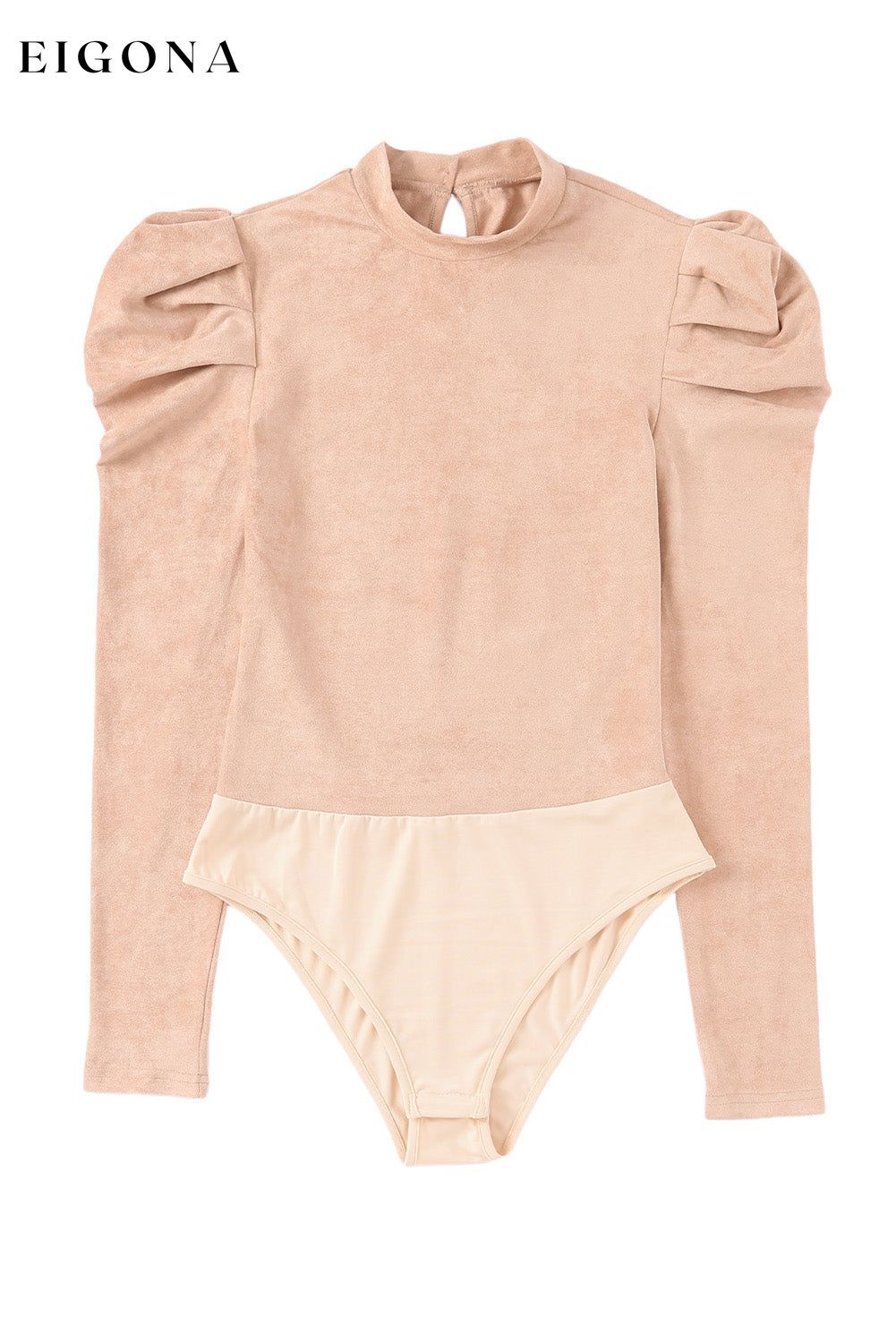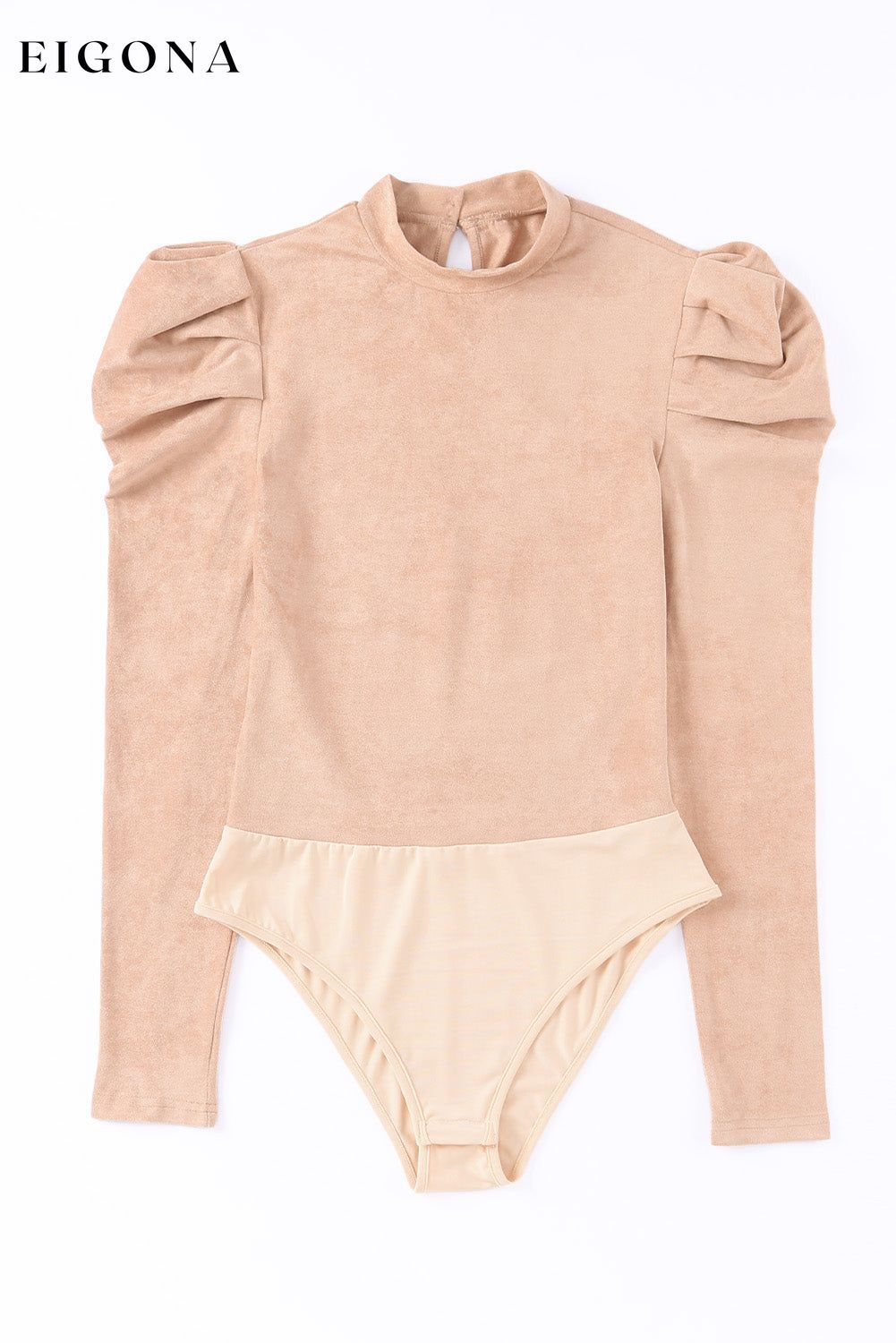 - The suede bodysuit with puff sleeves and a mock neckline is elegant