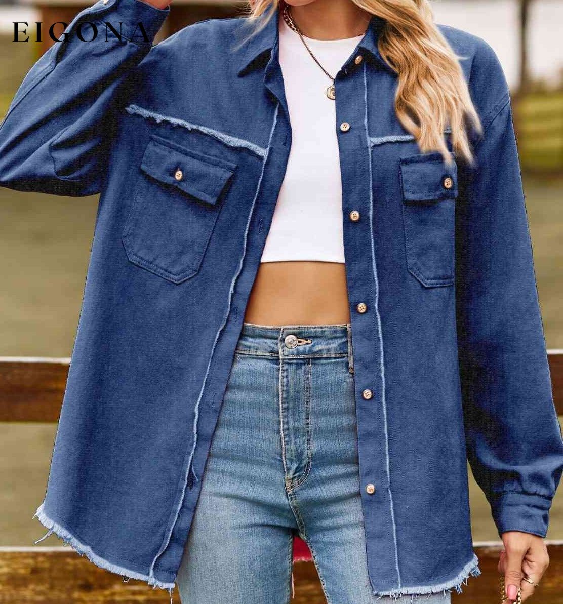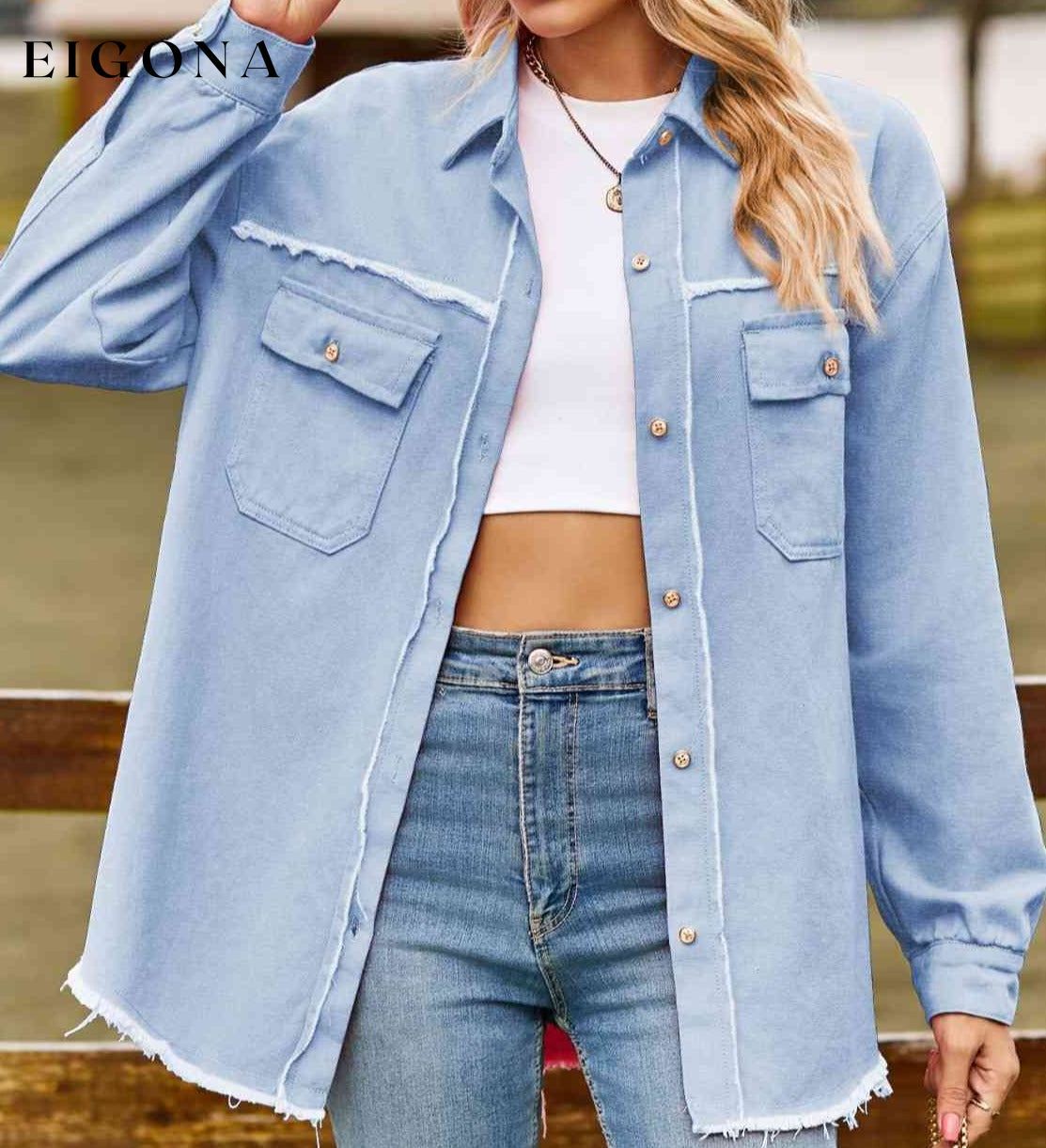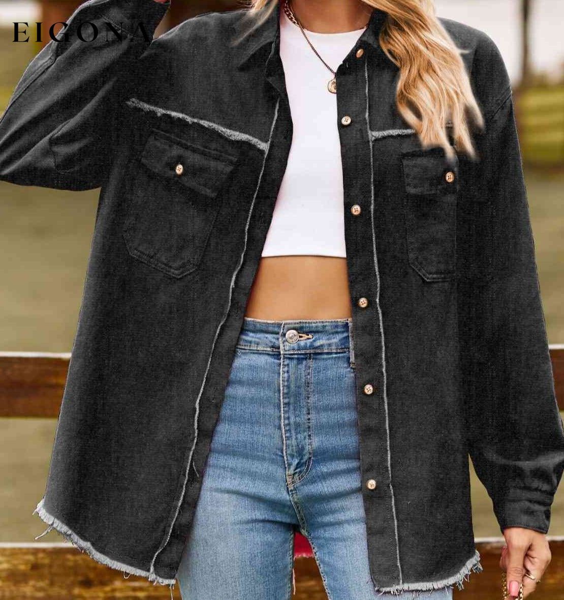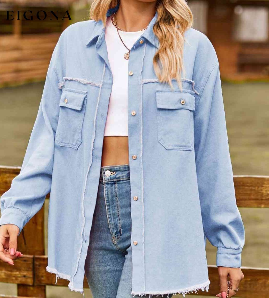 Button Up Collared Neck Raw Hem Denim Top