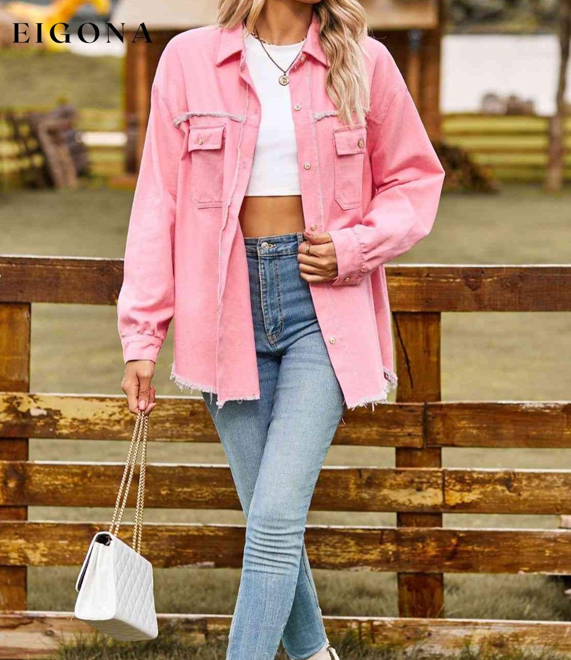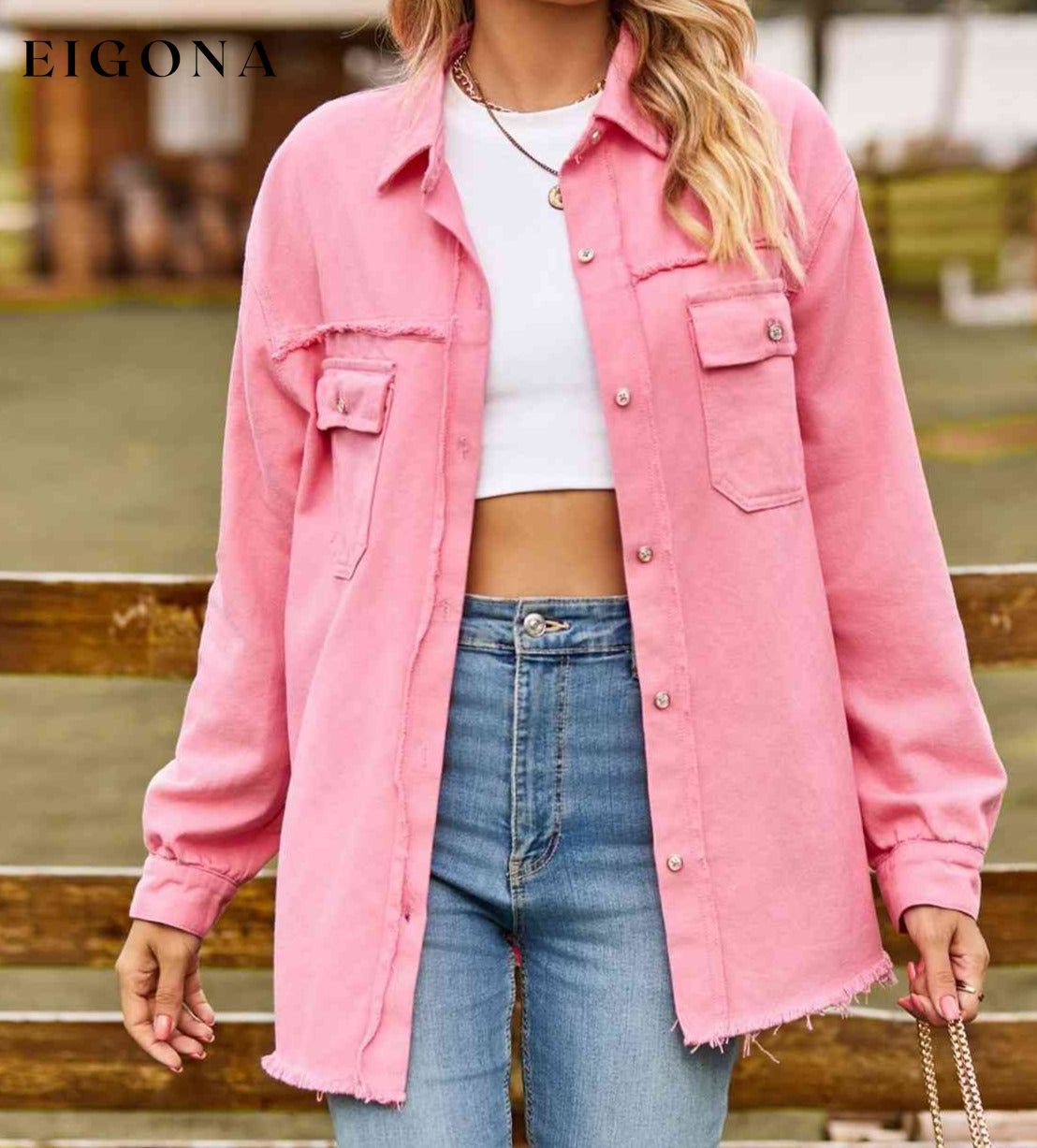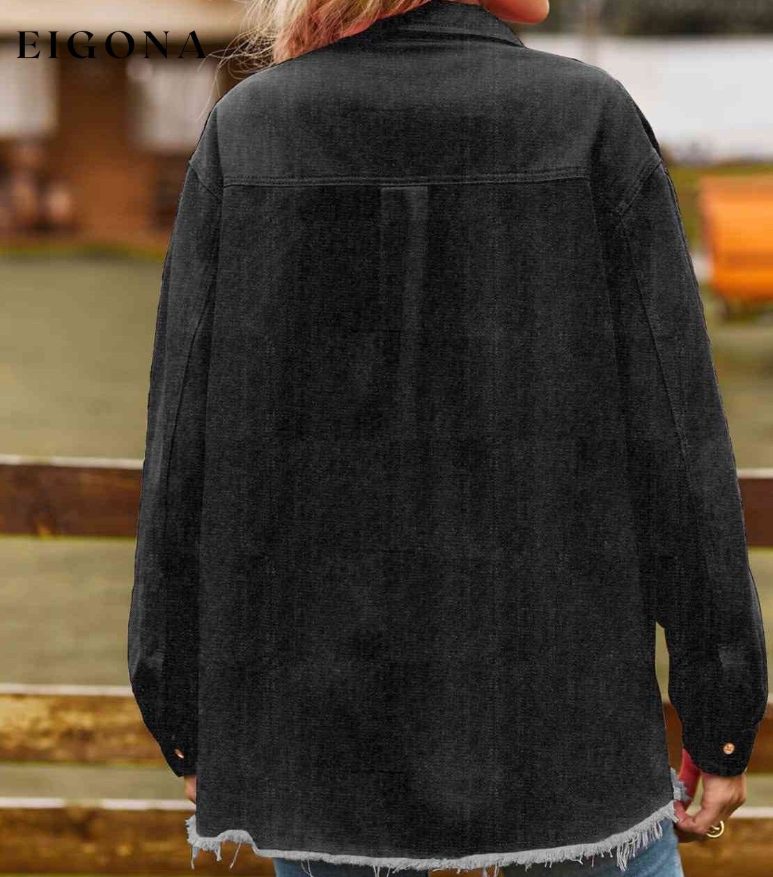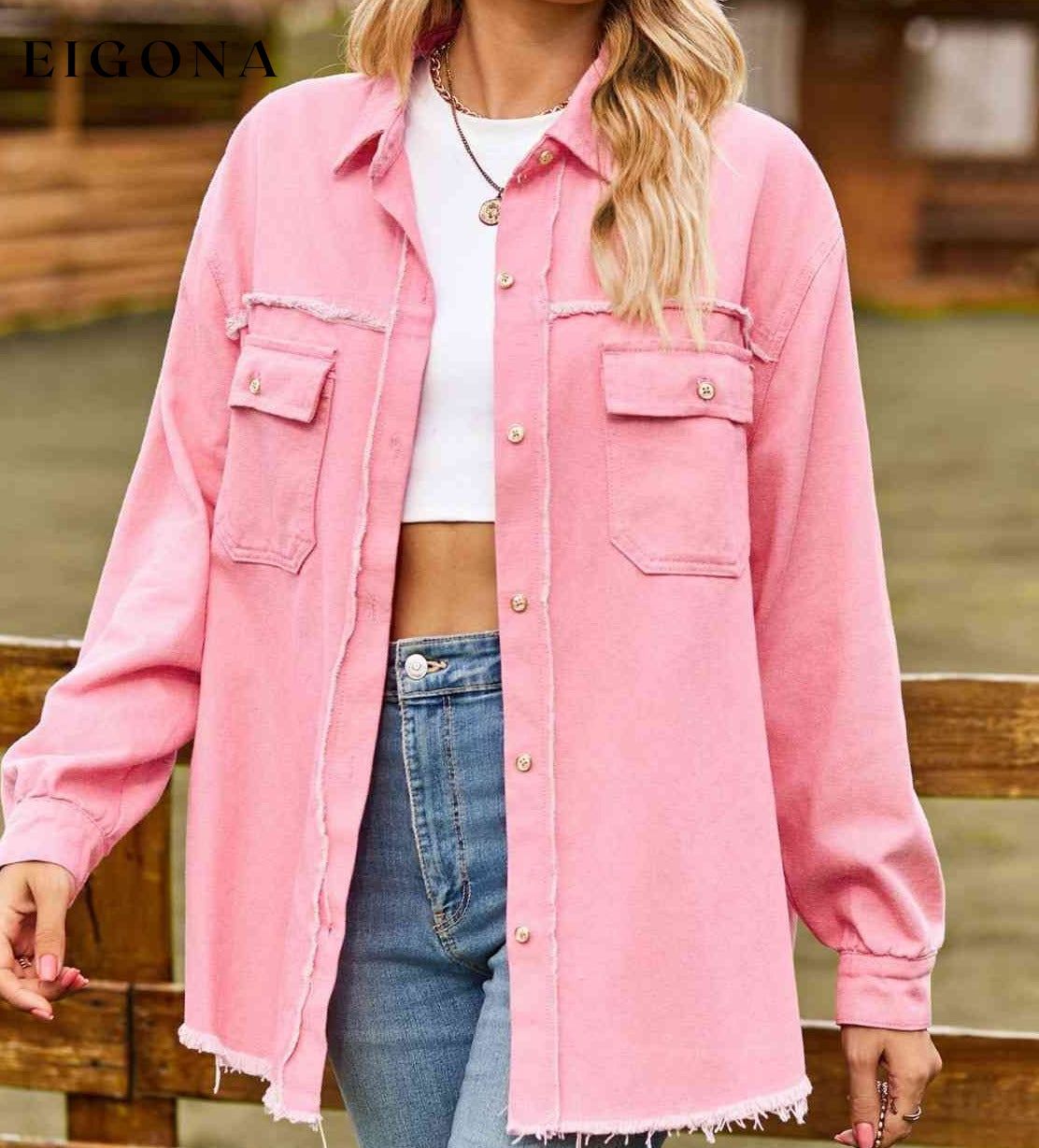 Button Up Collared Neck Raw Hem Denim Top
