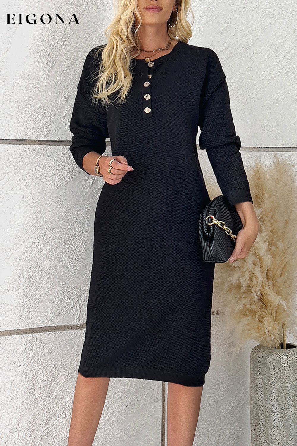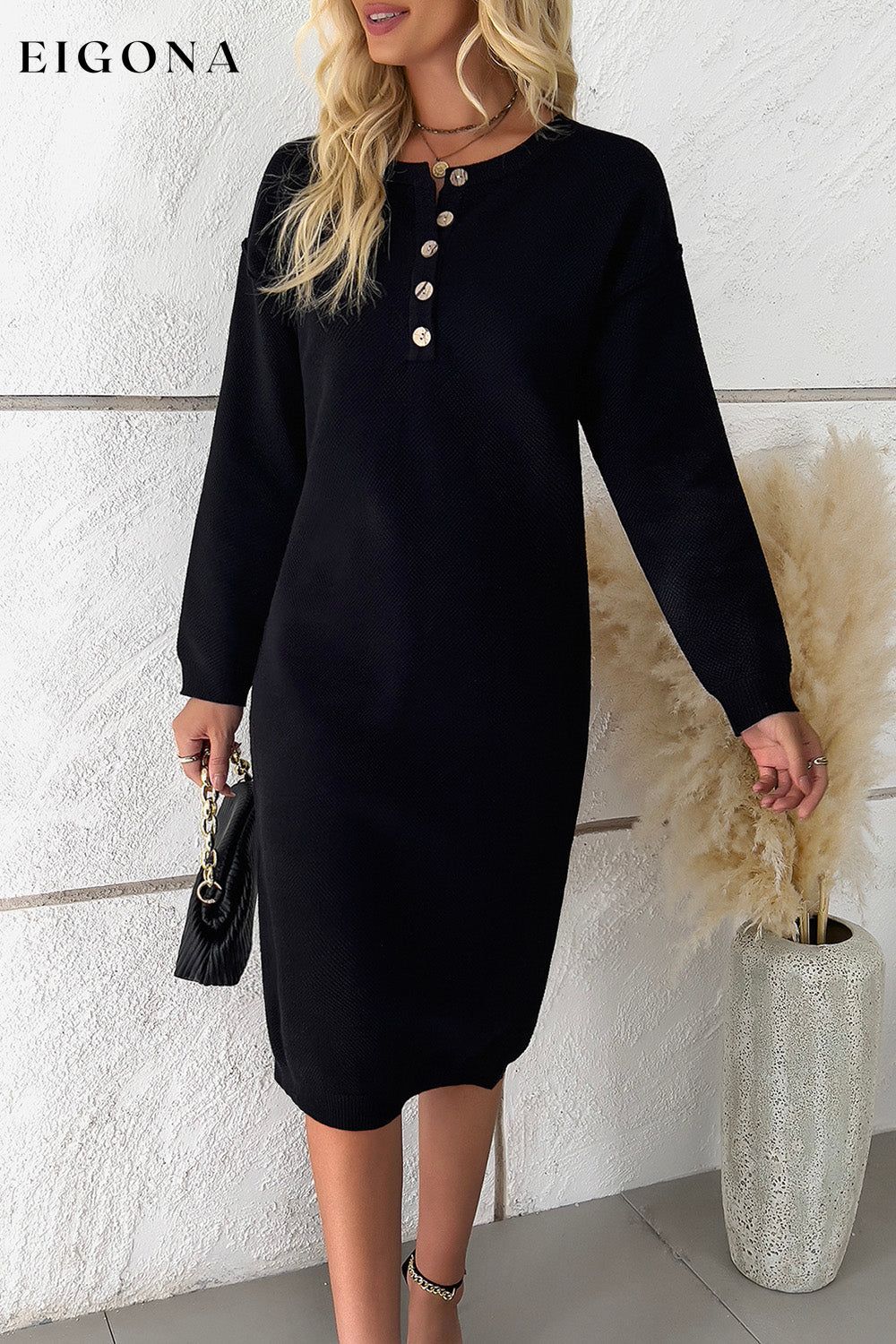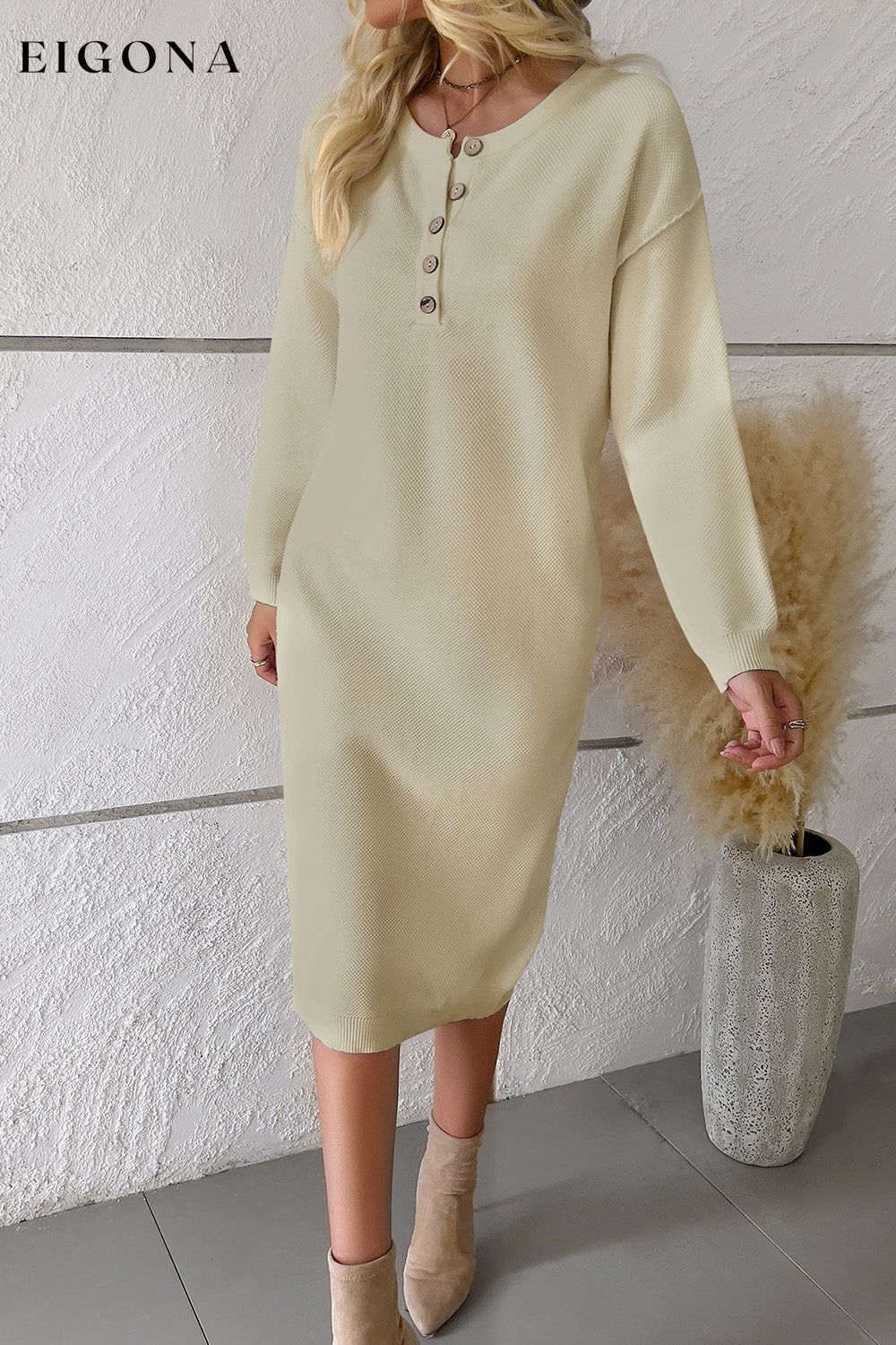 Buttoned Drop Shoulder Sweater Dress, Casual Long Sleeve Dresses