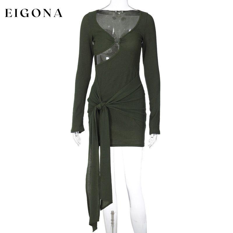 Fashionable V neck Ribbon Dress Women Clothing Autumn Solid Color Long Sleeve Slim Hip Dress