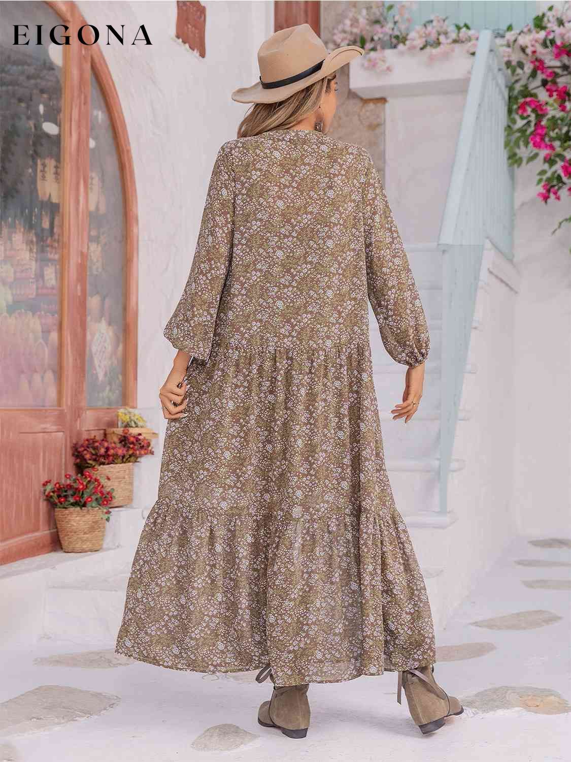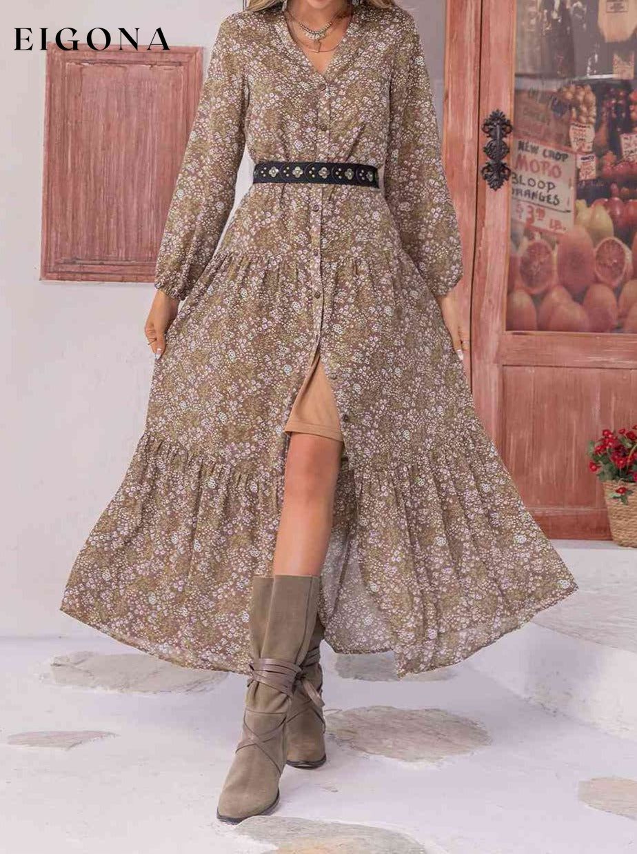 Floral Button Up V-Neck Tiered Casual Long Sleeve Maxi Dress