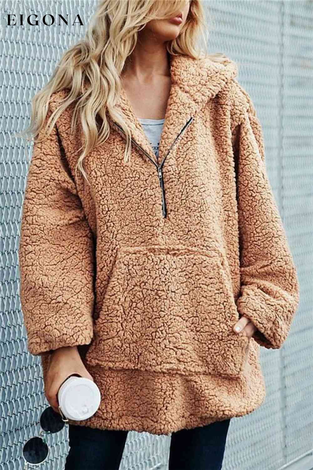 Full Size Half Zip Up Teddy Hoodie Jacket Sweater with Front Pocket