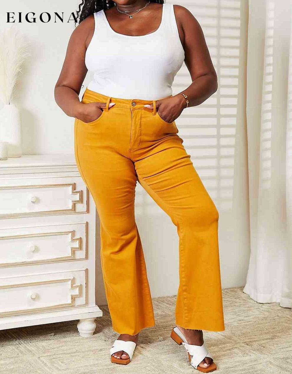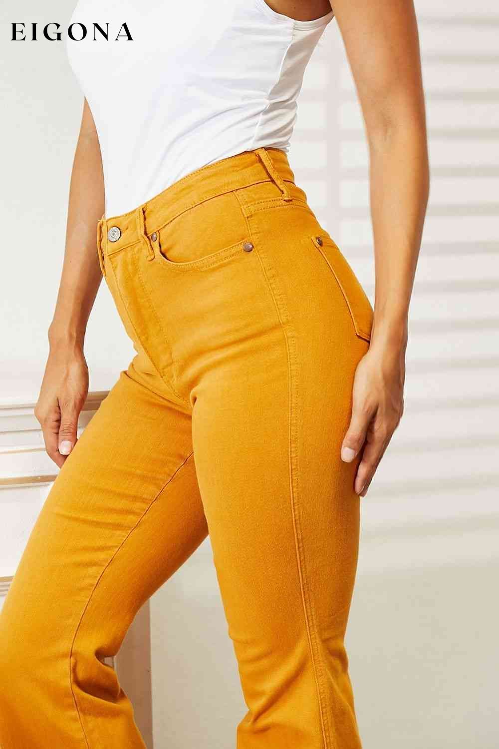 These jeans combine contemporary style with body-enhancing features. Engineered with tummy control technology, these jeans offer a slimming effect and comfortable support. The high waist design not only flatters the figure but also elongates the silhouette. The garment-dyed finish lends a unique and rich color saturation, adding depth to the jeans' overall aesthetic. With their flared leg silhouette, these jeans offer a touch of retro-chic while providing versatile options for both casual and more polished looks, making them an essential addition to any modern wardrobe.