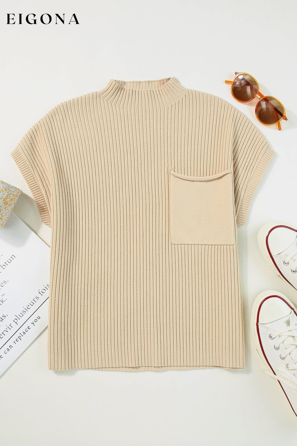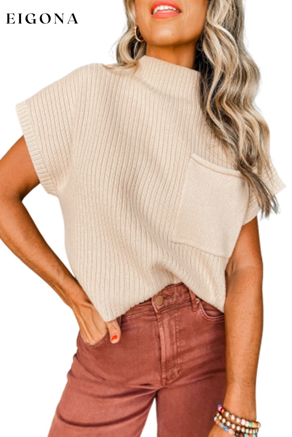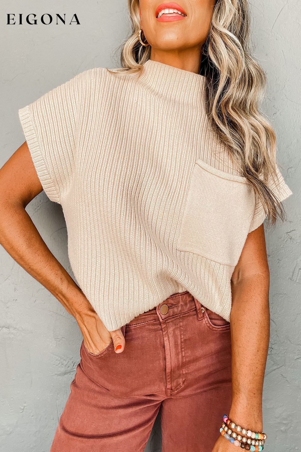 Oatmeal Patch Pocket Ribbed Knit Short Sleeve Sweater