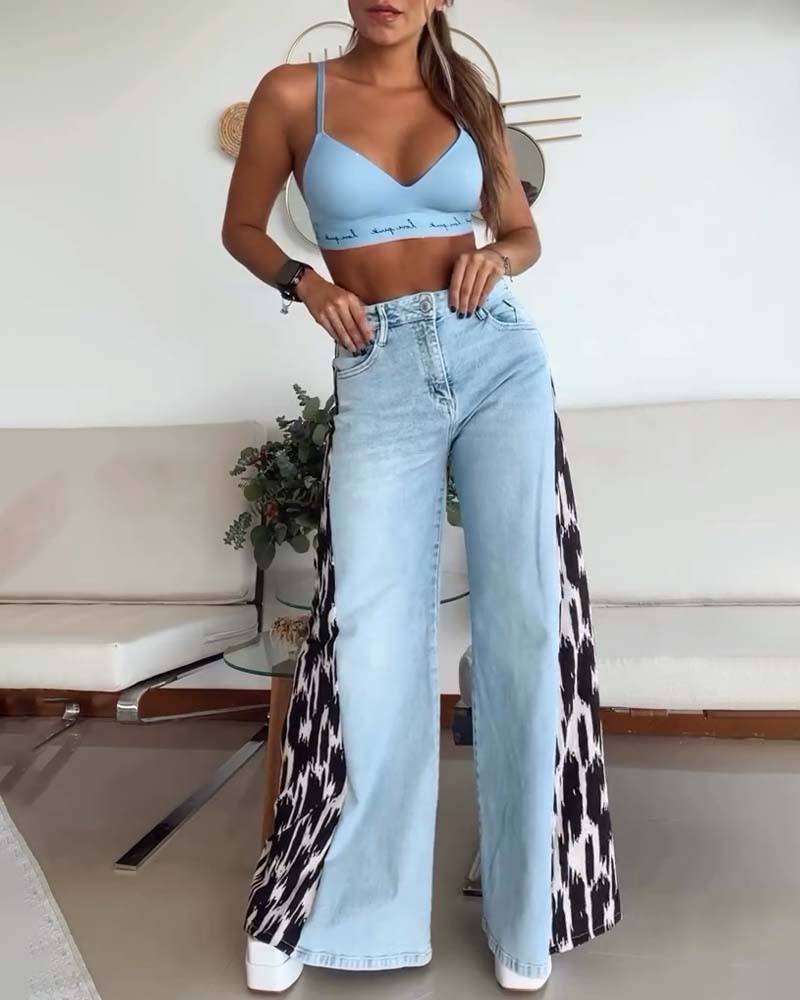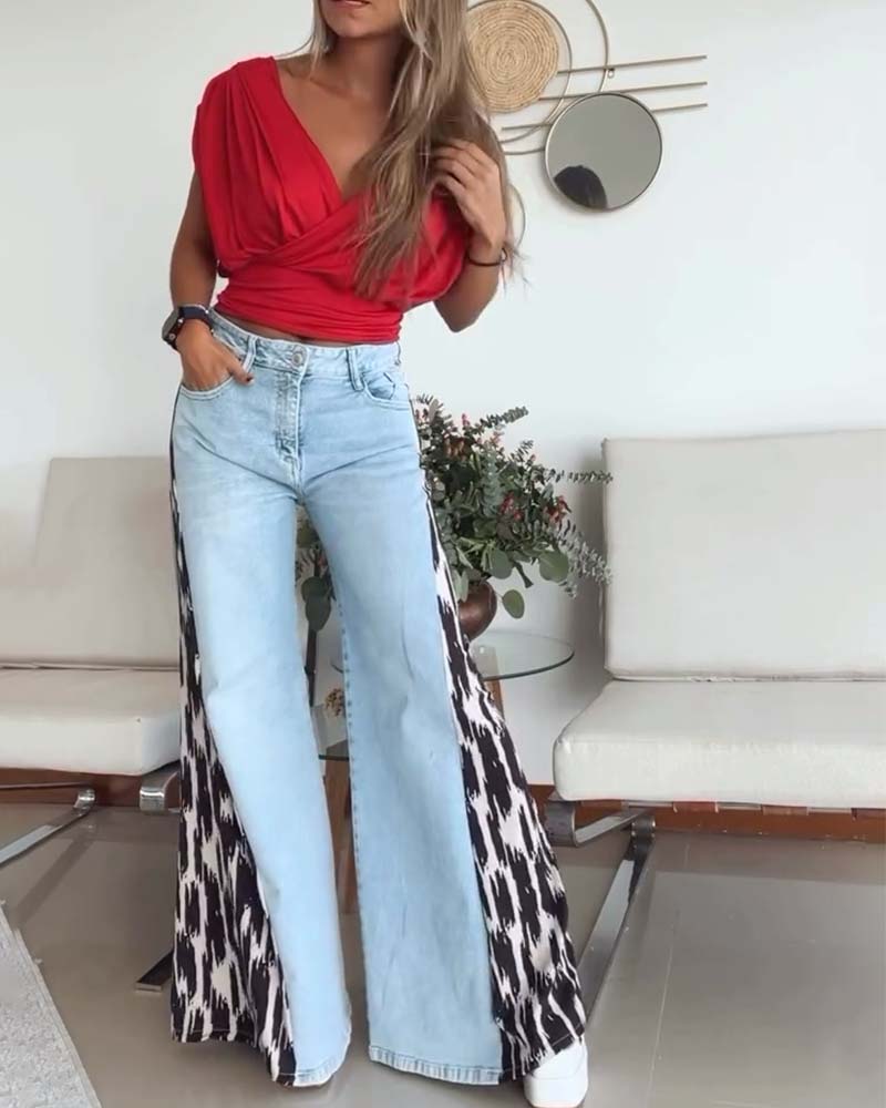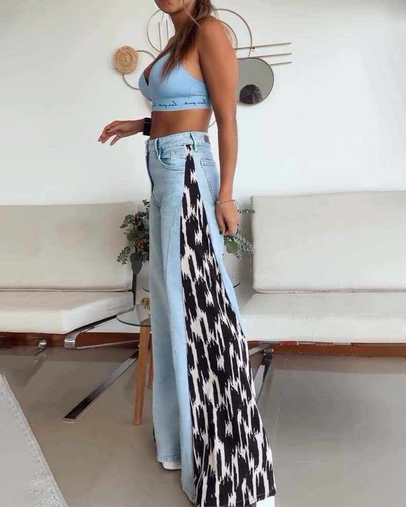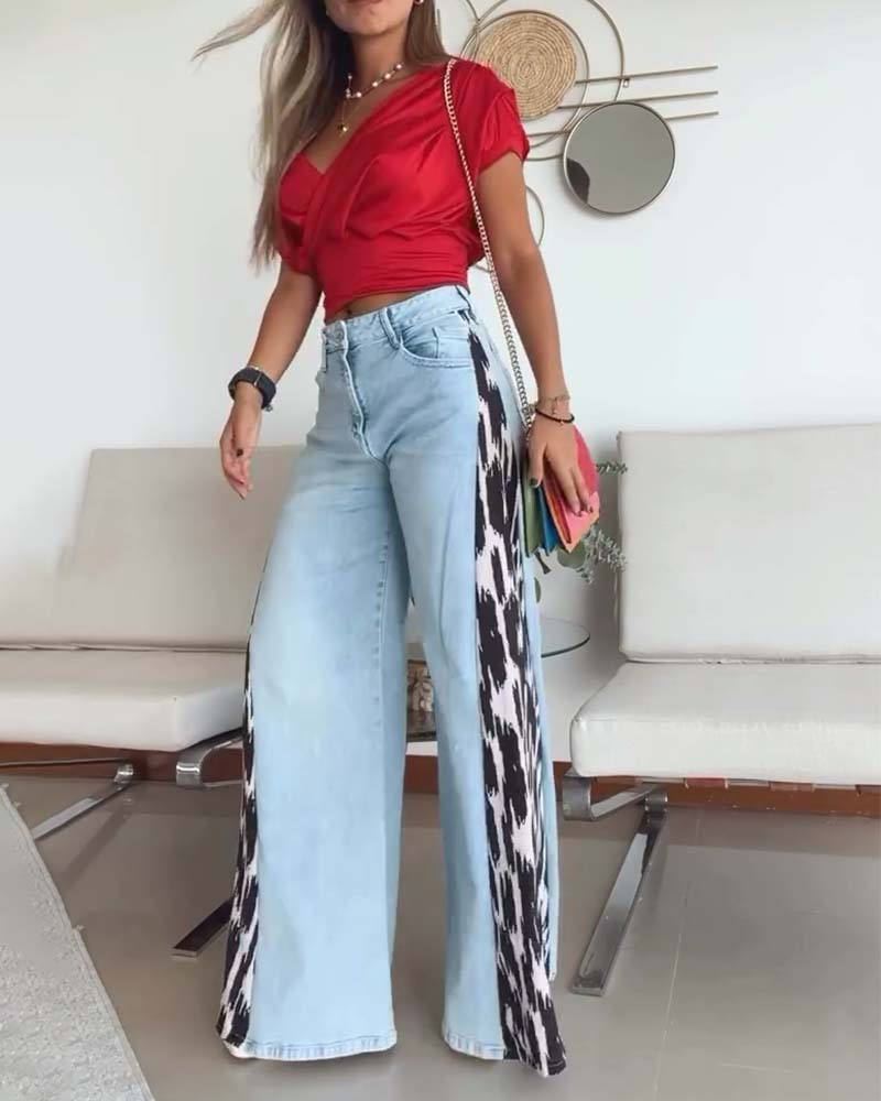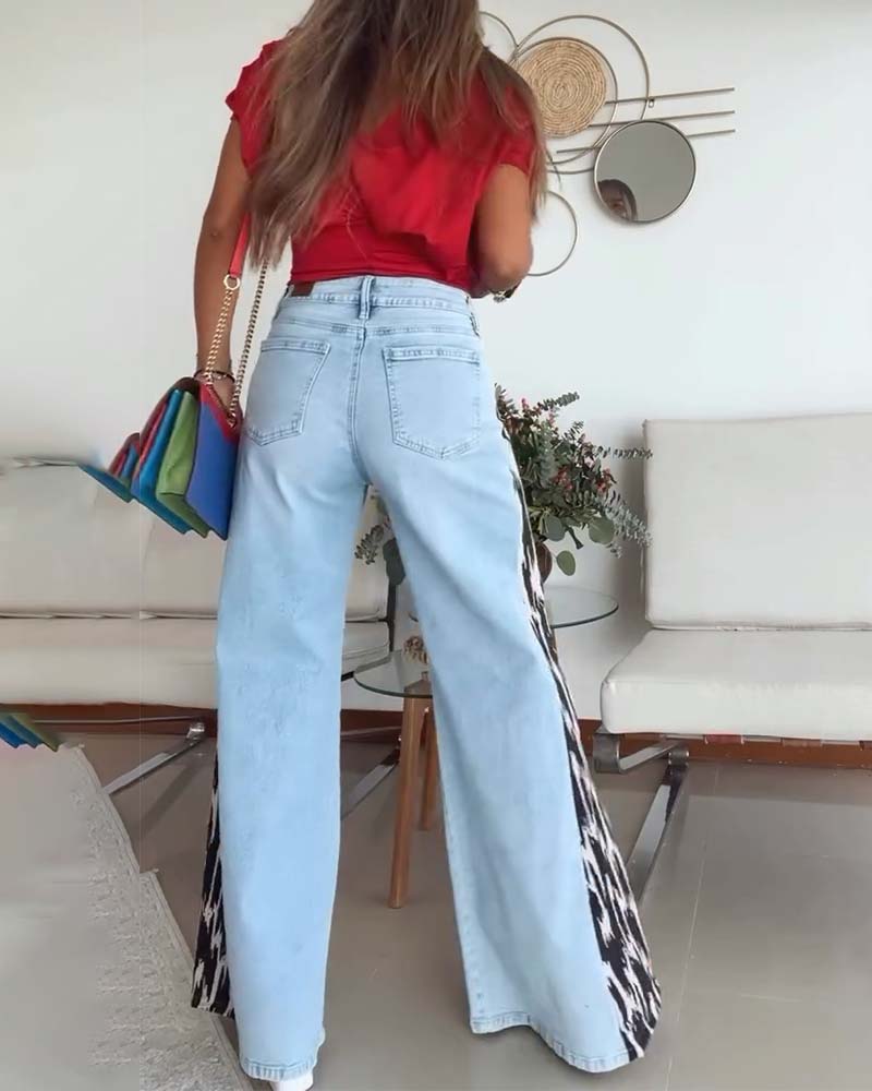 Paneled leopard print wide-leg jeans