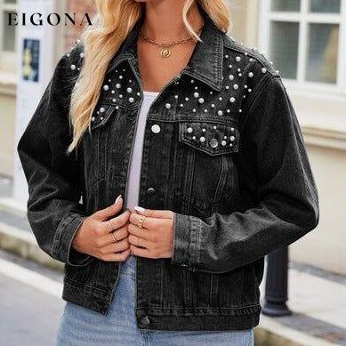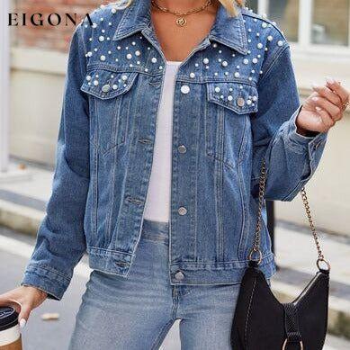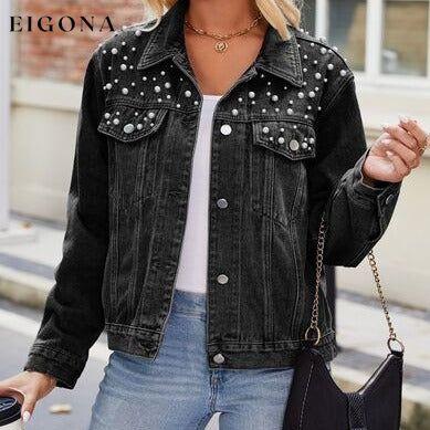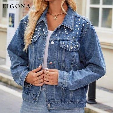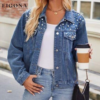 Pearl Detail Collared Neck Long Sleeve Denim Jacket