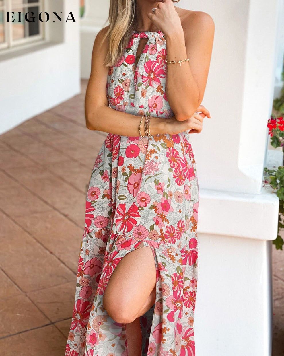 Pink Lace-up Halter Backless High Waist Floral Maxi Dress