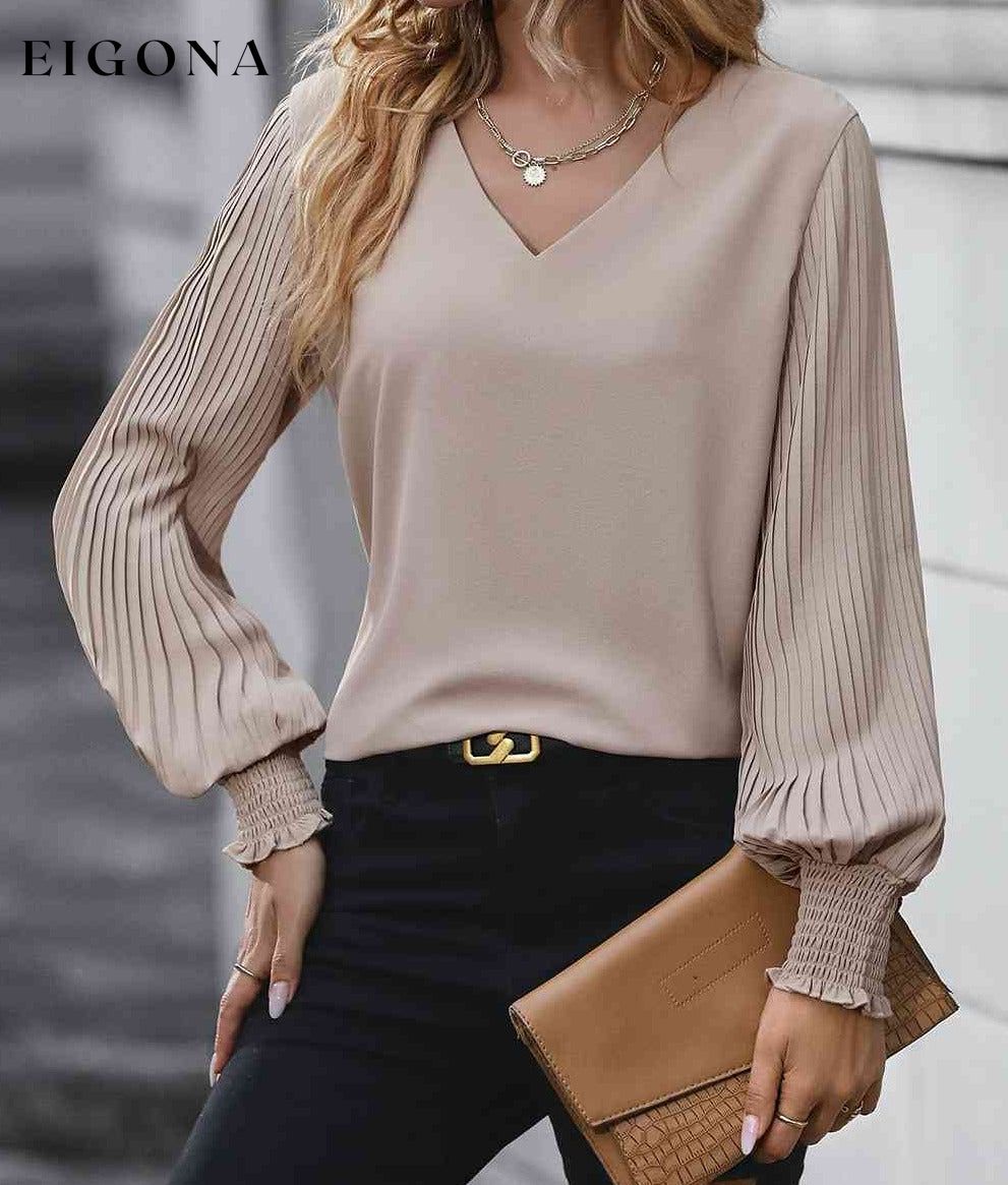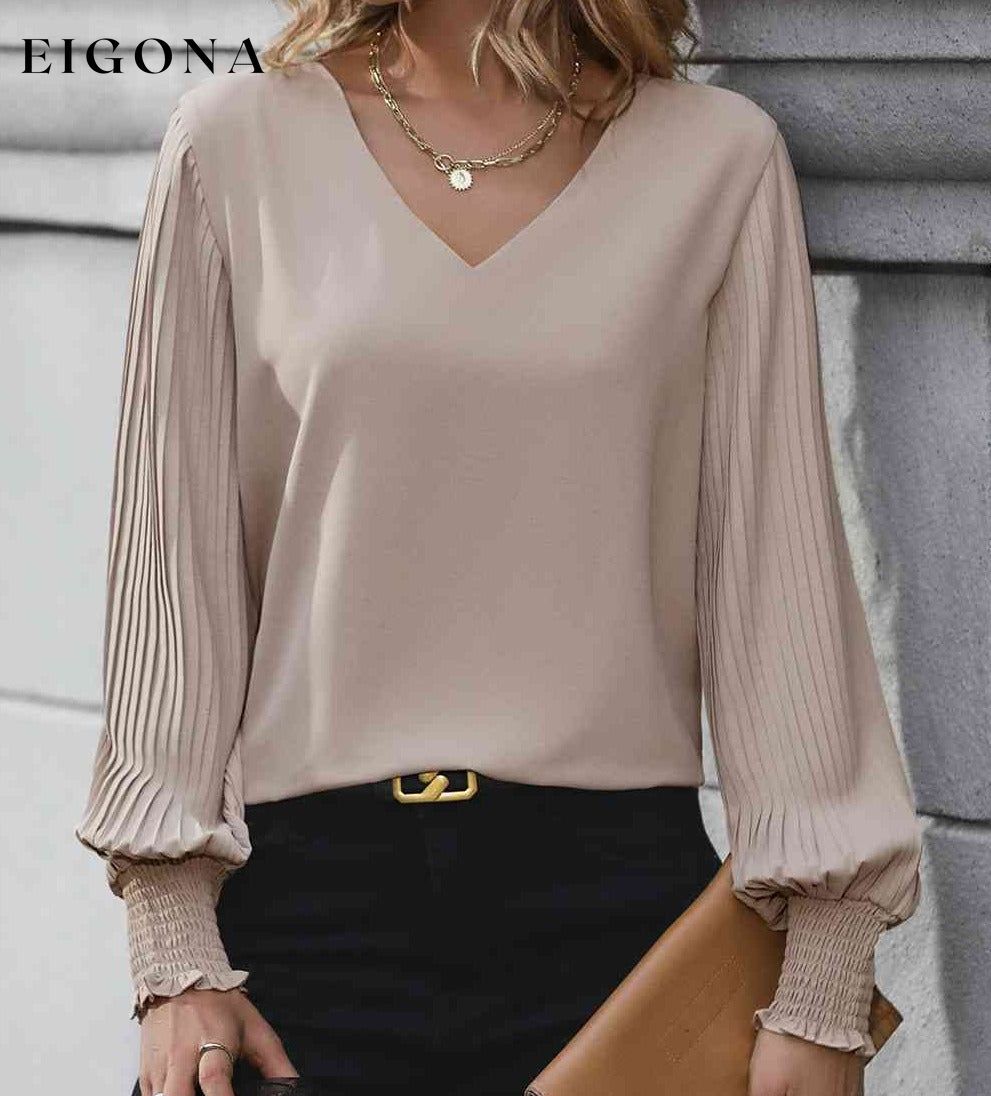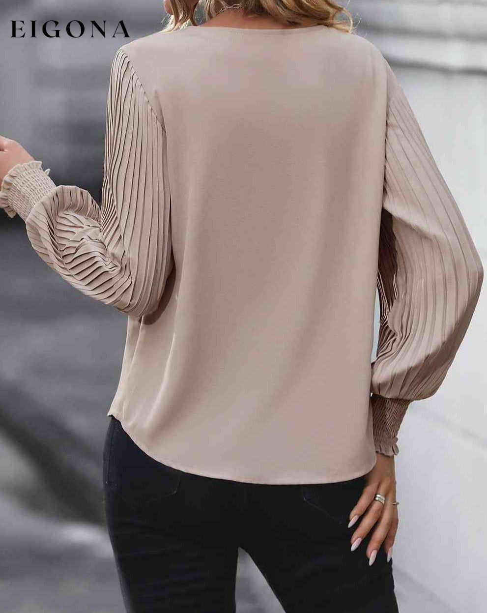Pleated Lantern Sleeve V-Neck Long Sleeve Blouse