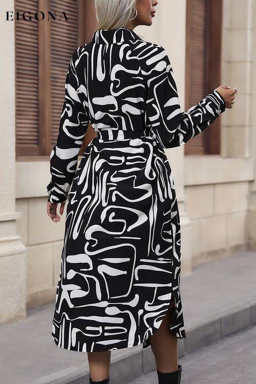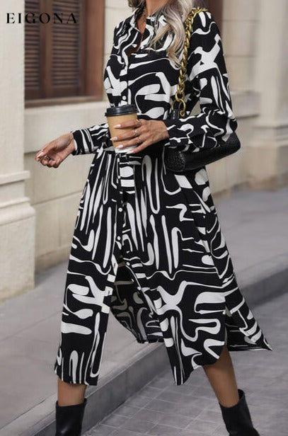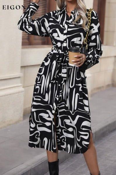 Printed Tie Front Collared Neck Slit Shirt Dress
