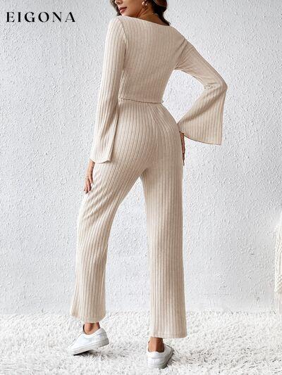 Ribbed Flare Sleeve Top and Pants Set, Loungewear Sets