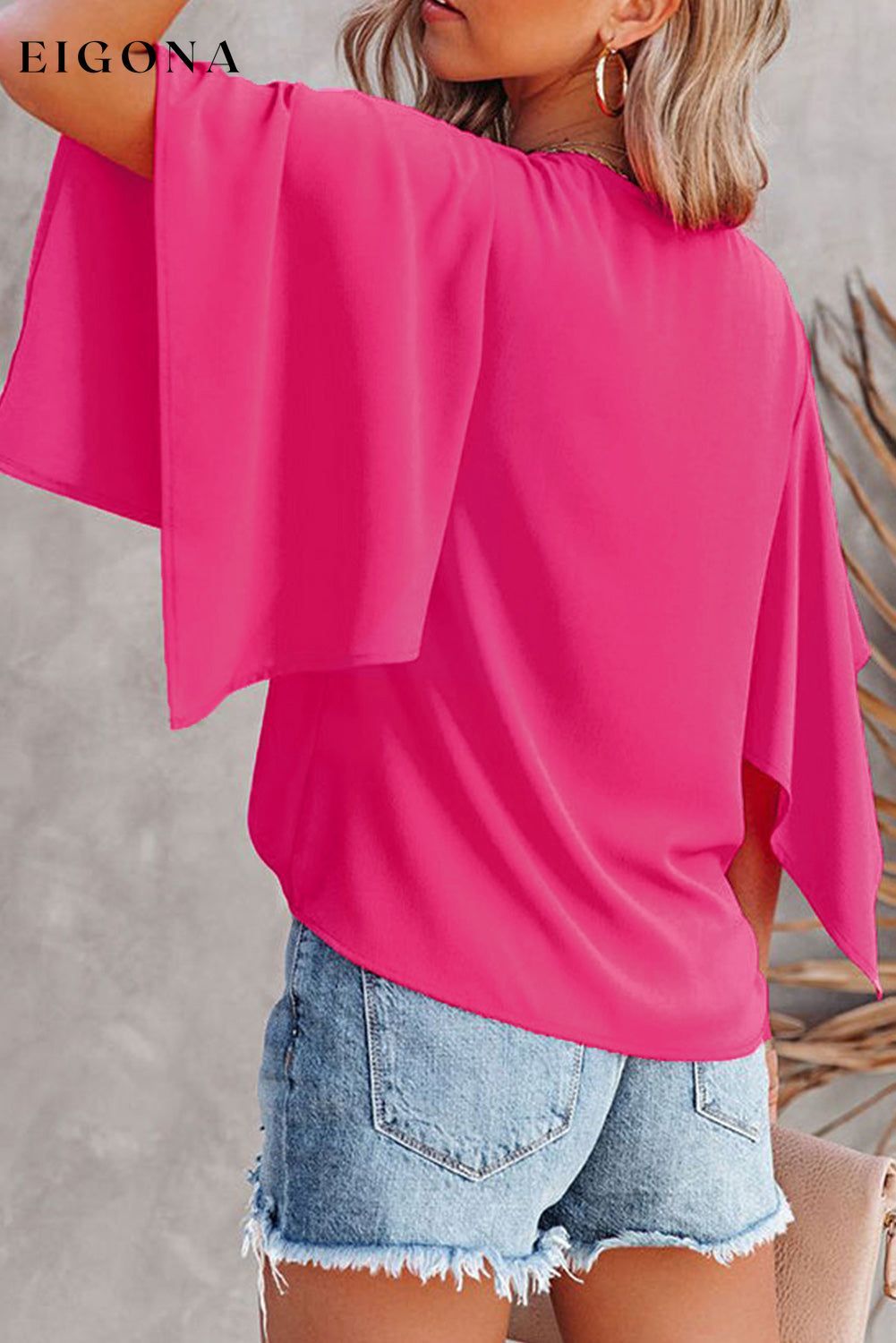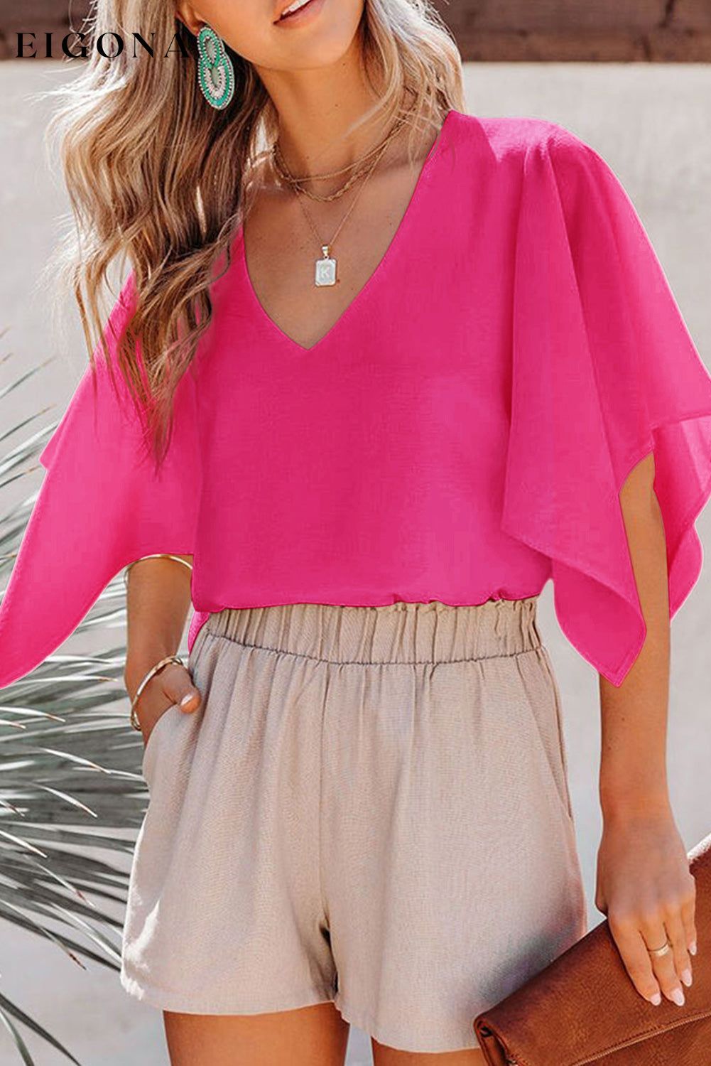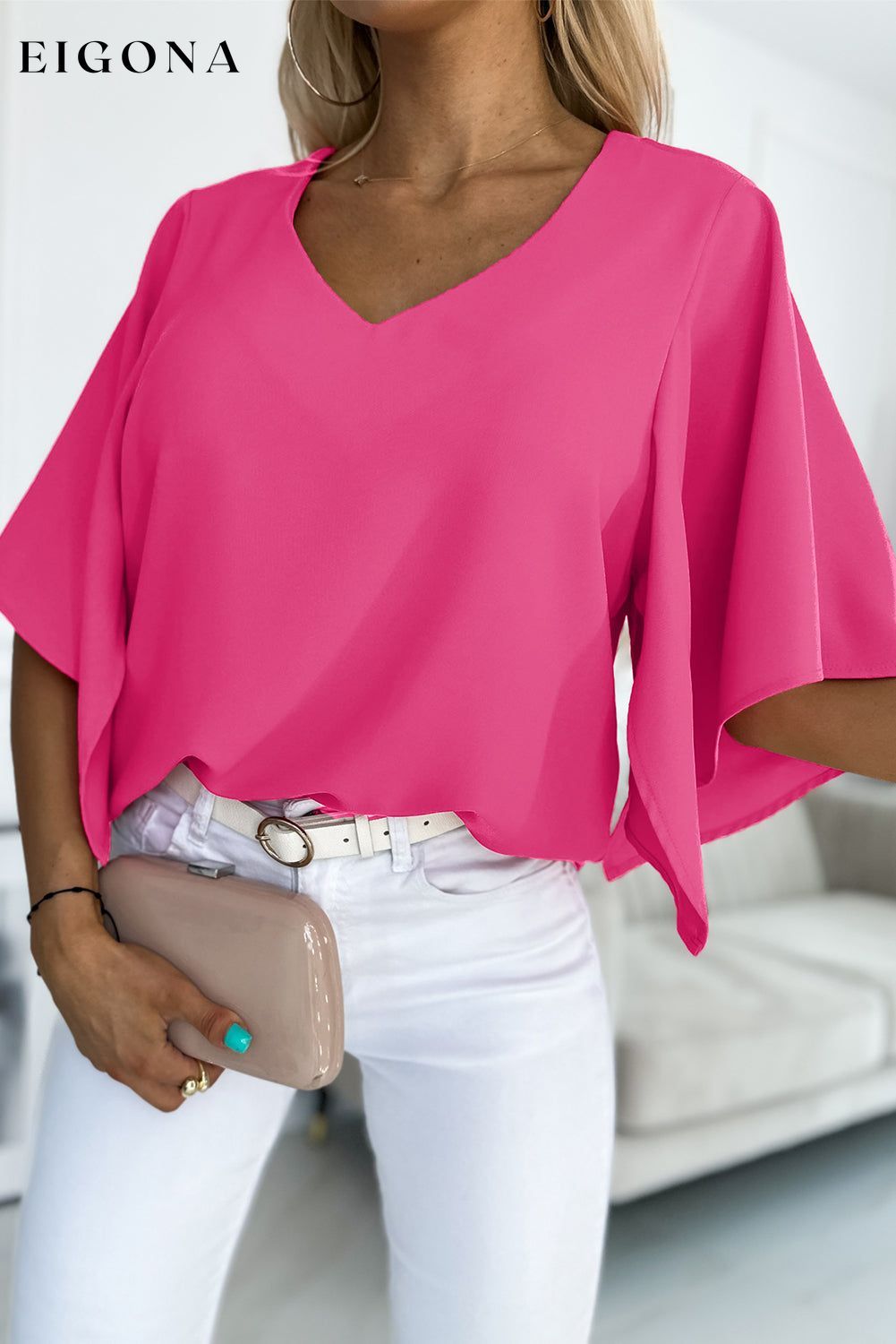 Rose Plain Flounce Bell Sleeve V Neck Blouse