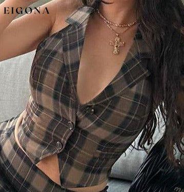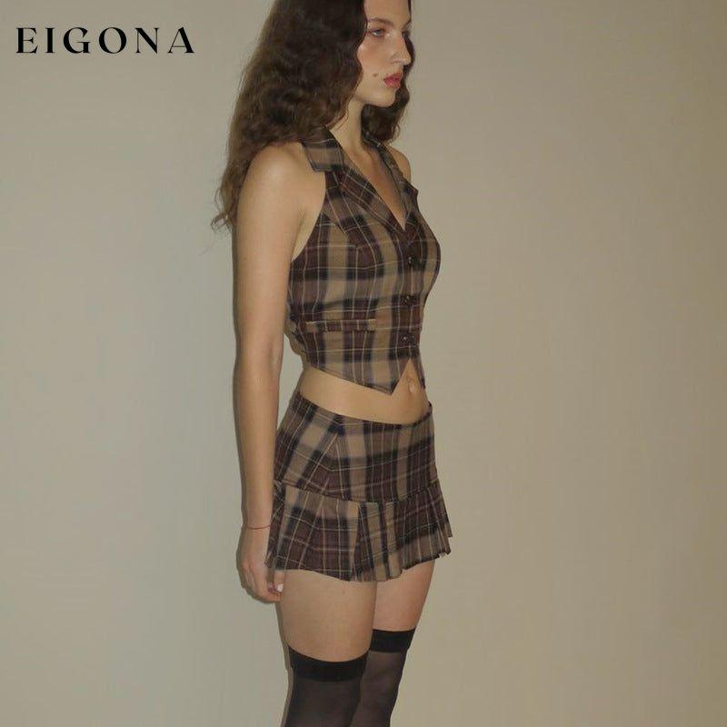 Sexy Two Piece Suit Summer Sexy Retro Plaid Vest Graceful Pleated Skirt Set