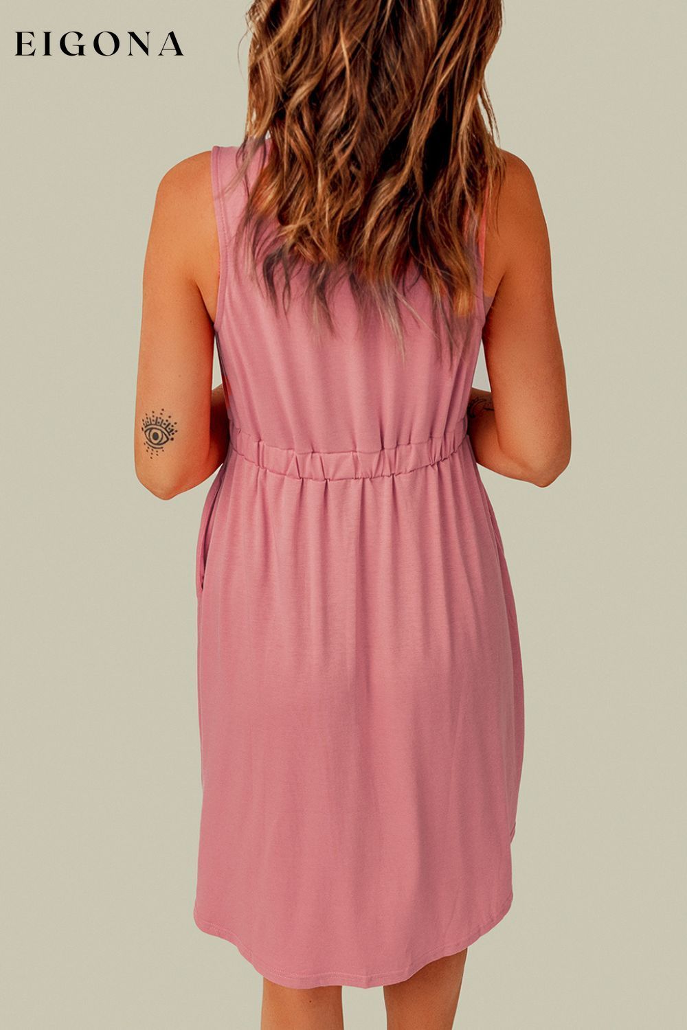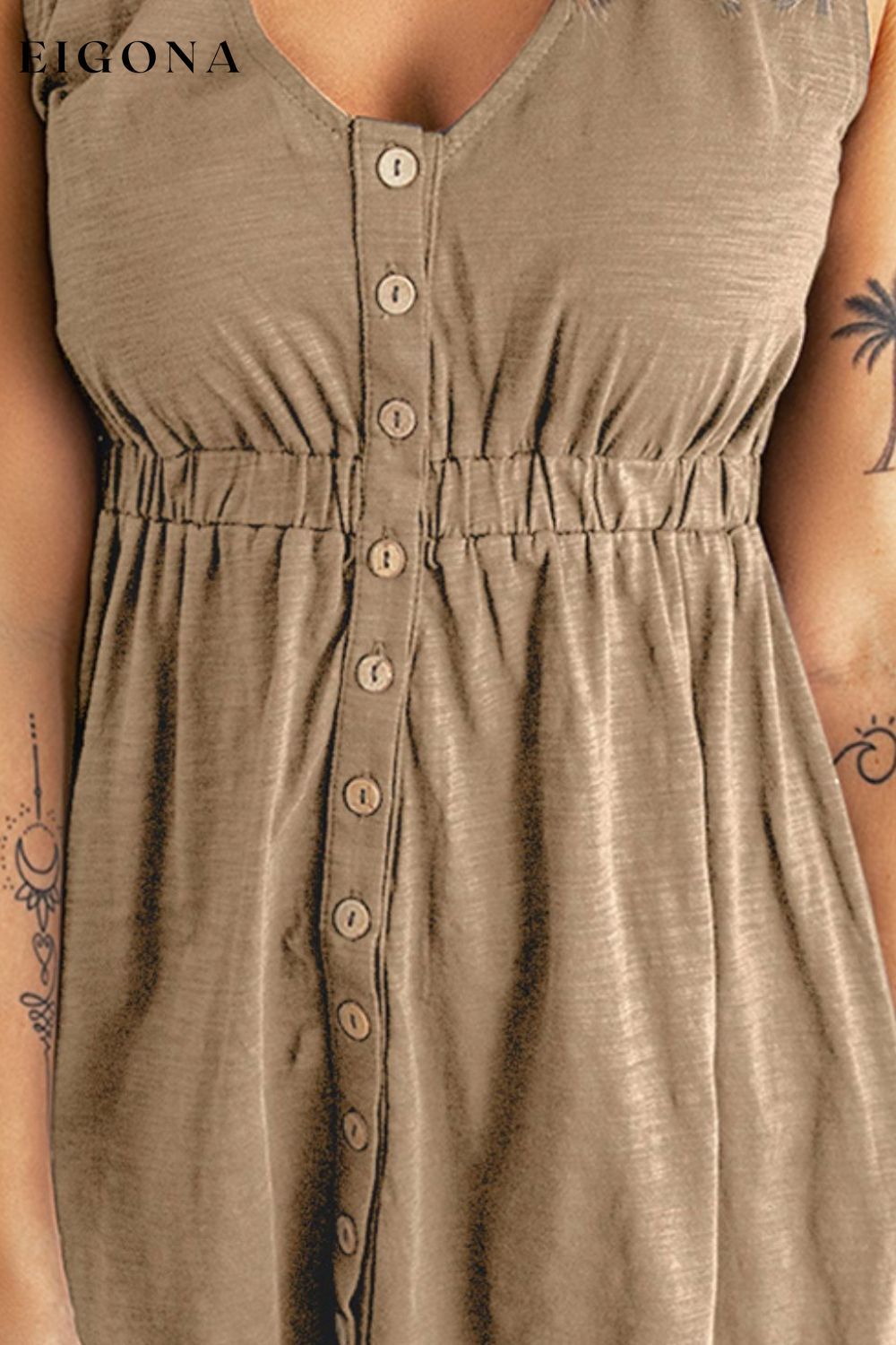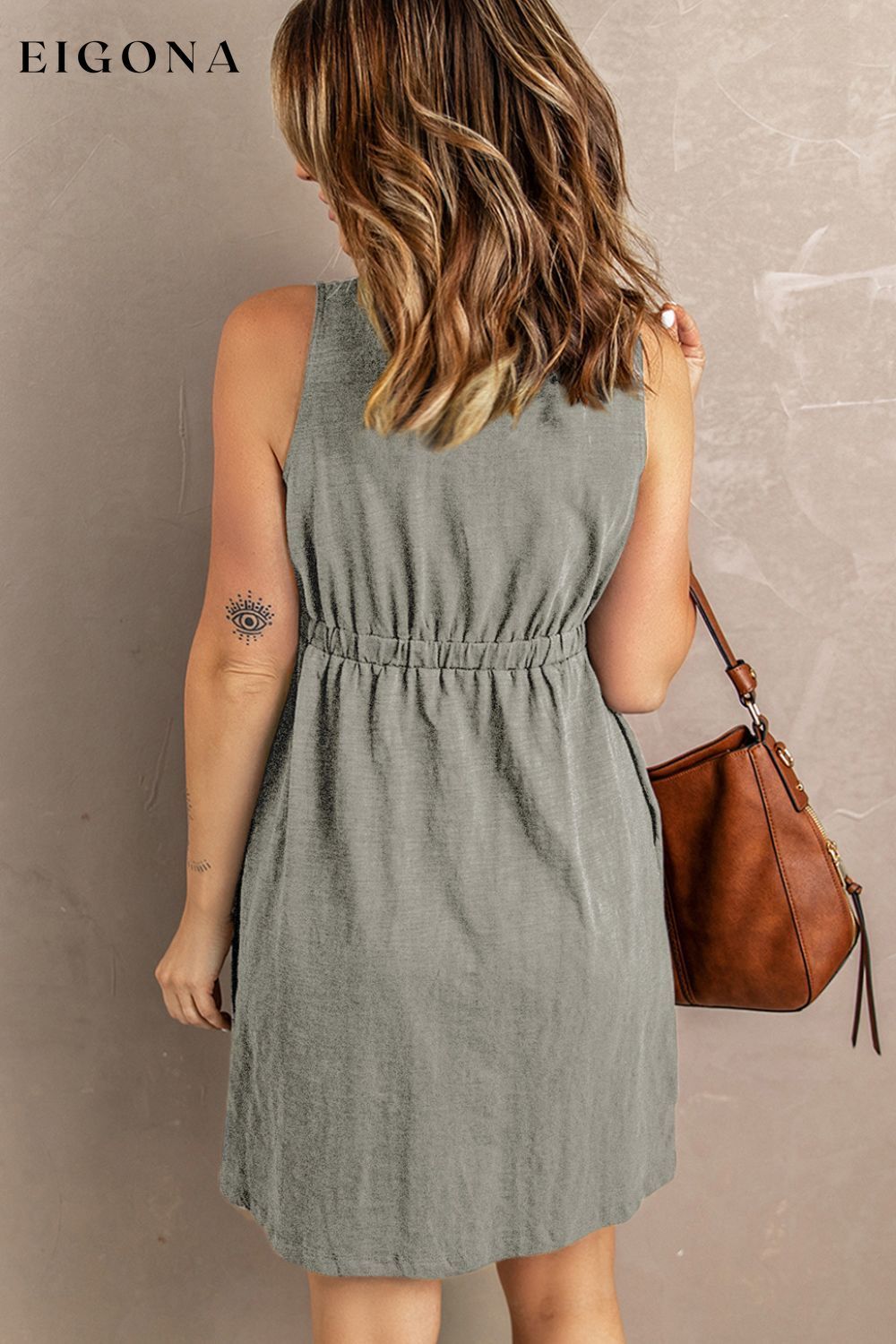 This flowy sleeveless dress features a v-neck, button front, and short mini length. Pair with your favorite sandals and a handbag for an effortless look.