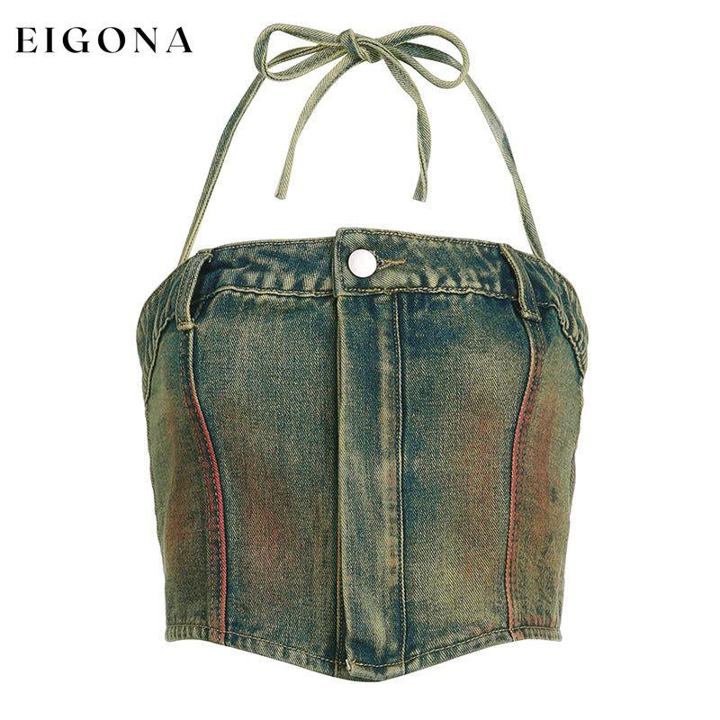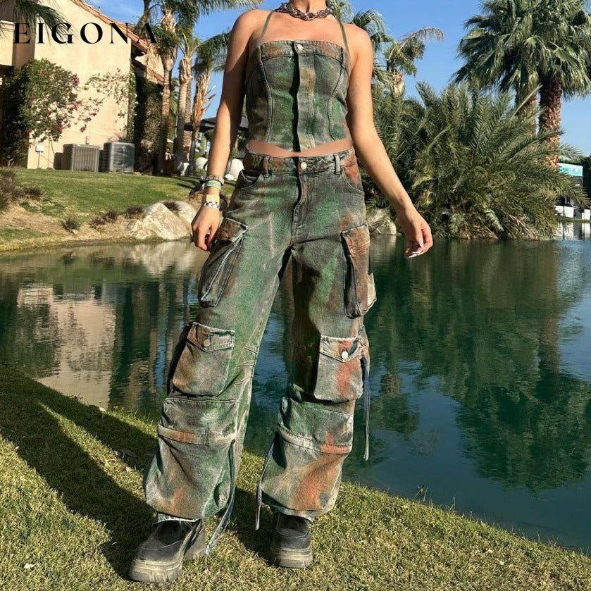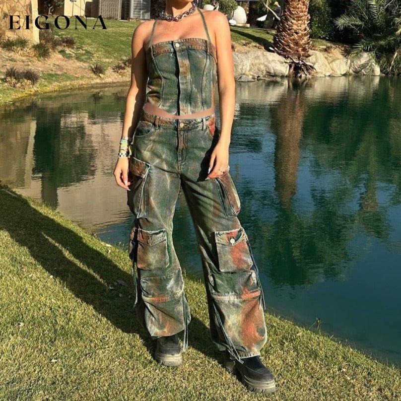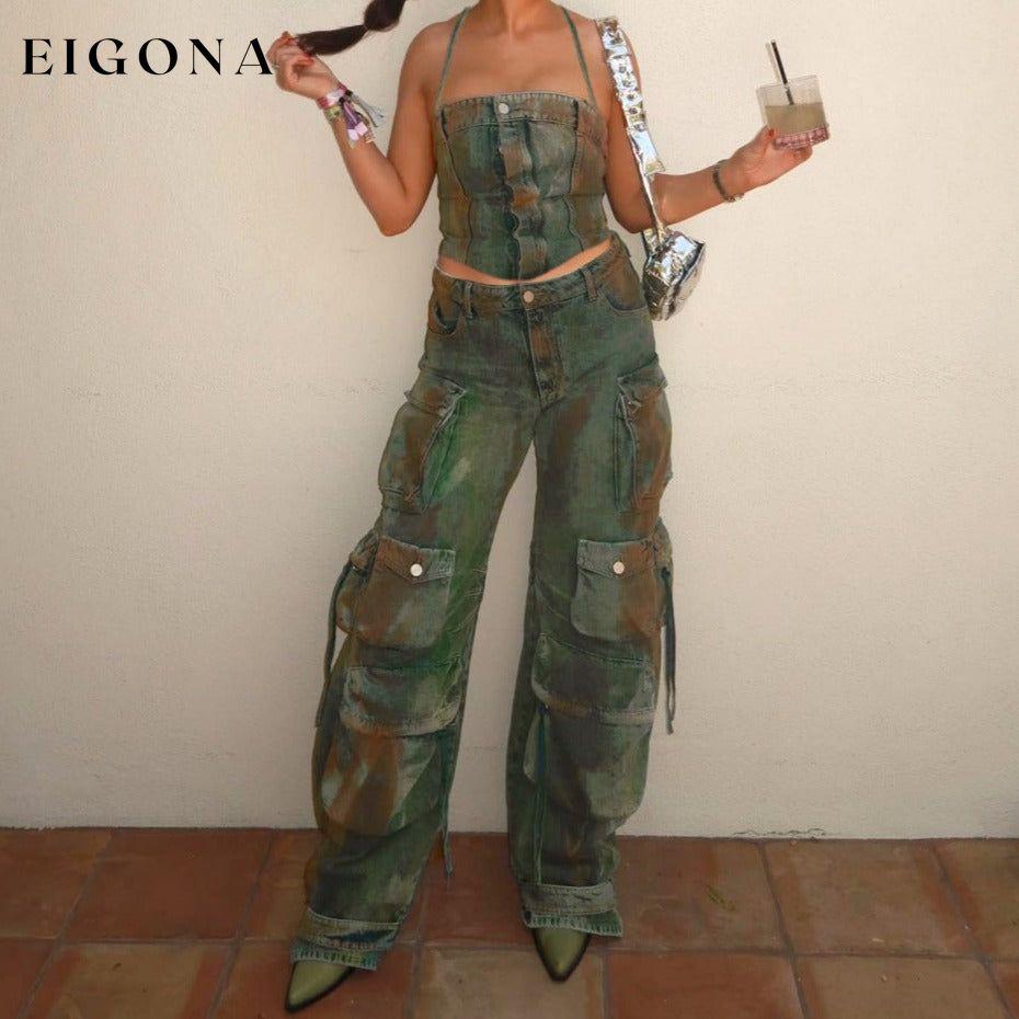 Street Women Clothing Heavy Industry Wash Gradient Color Halter Lace up Vest Zipper off Neck Bandeau Sling Pants Sets