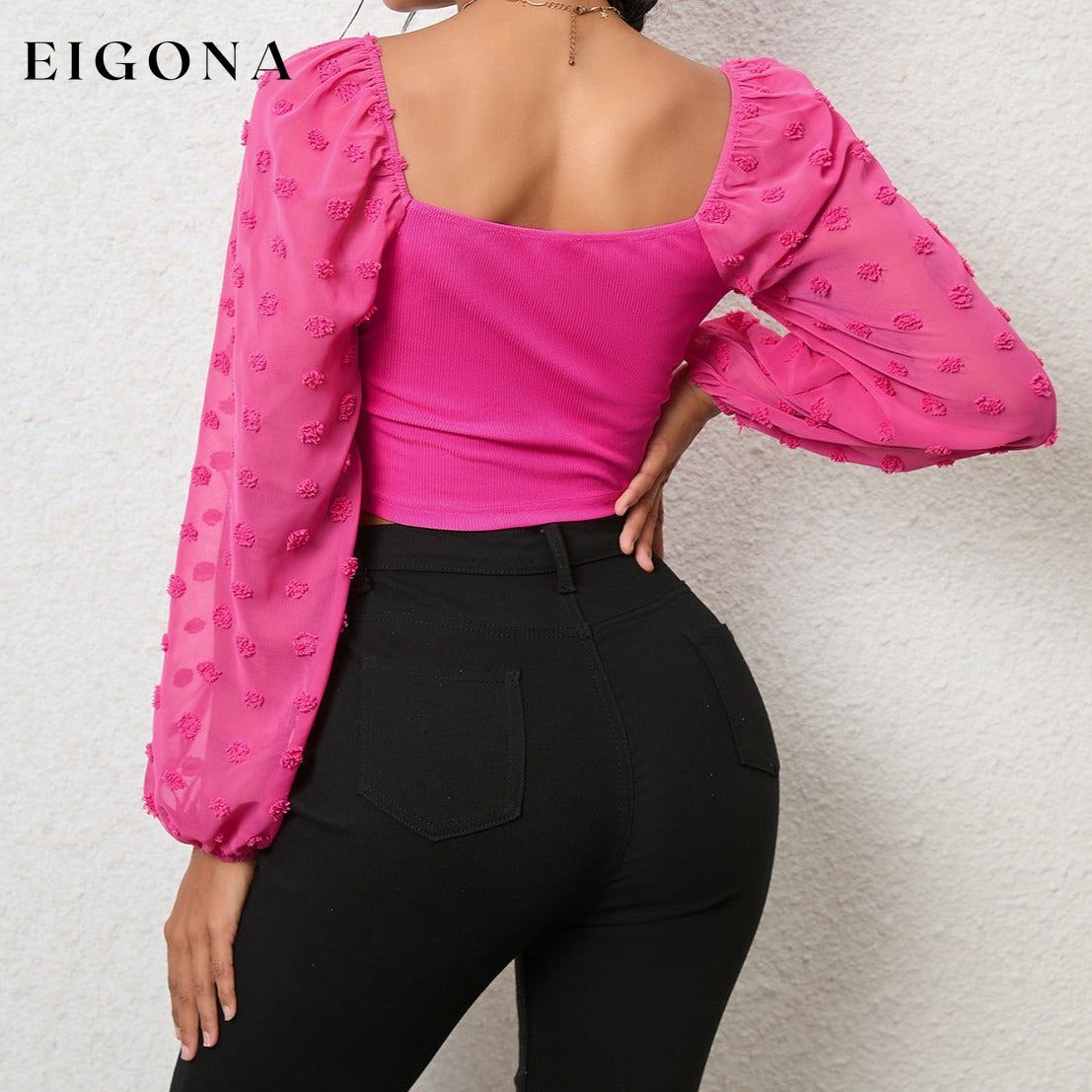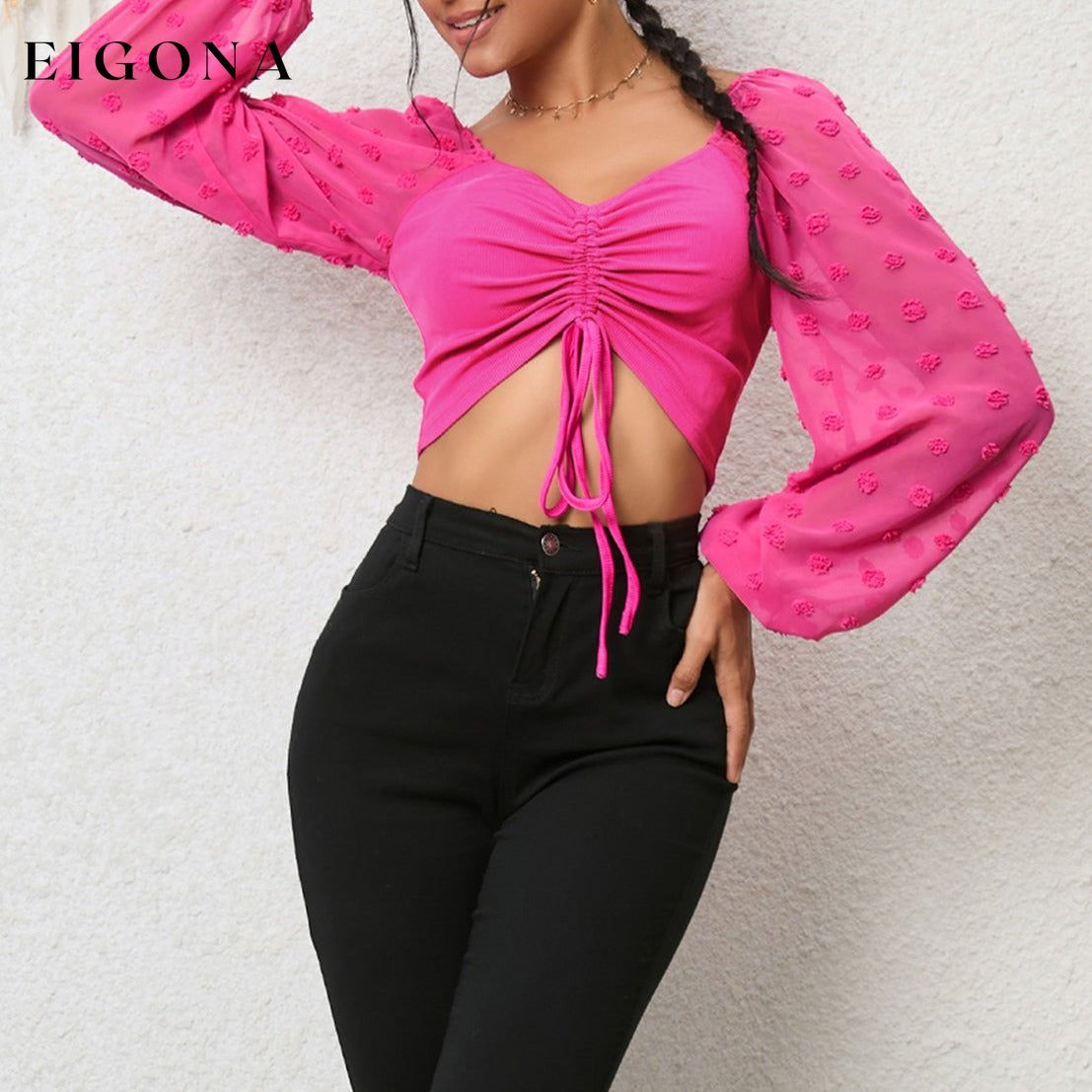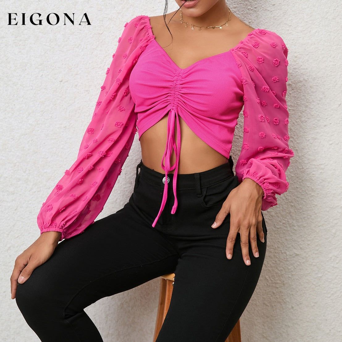 Swiss Dot Drawstring Cropped Blouse, Long Sleeve Crop top