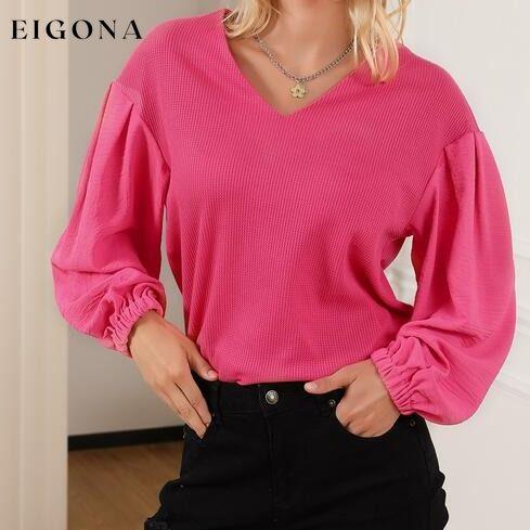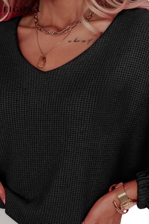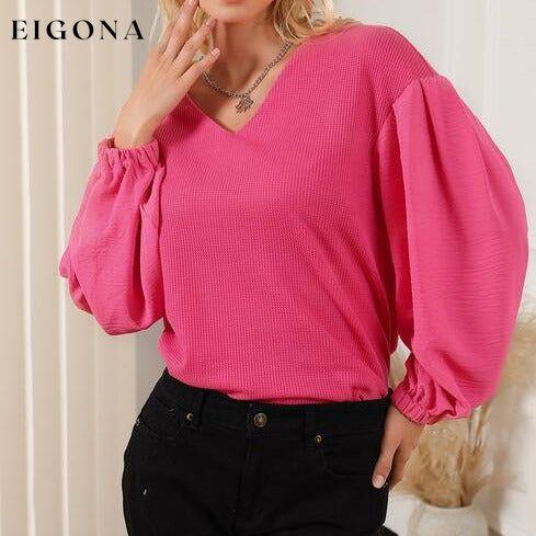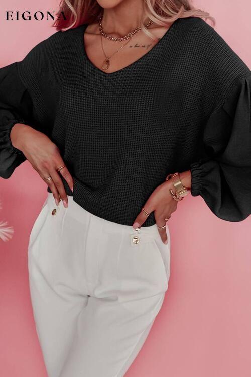 Waffle -Knit V-Neck Long Sleeve Blouse