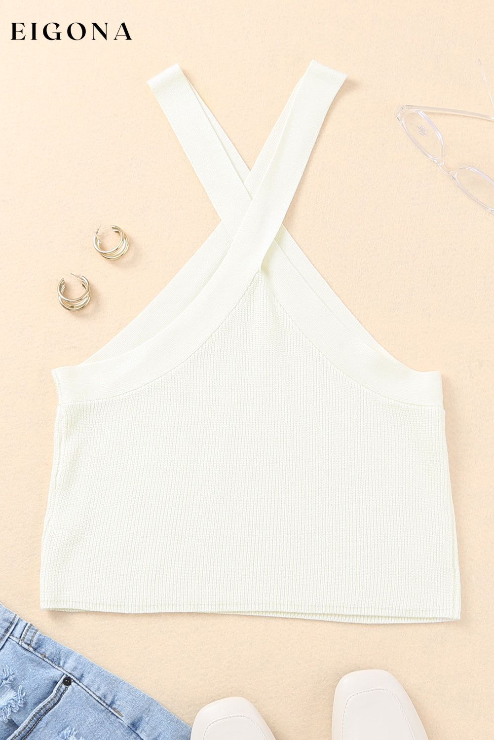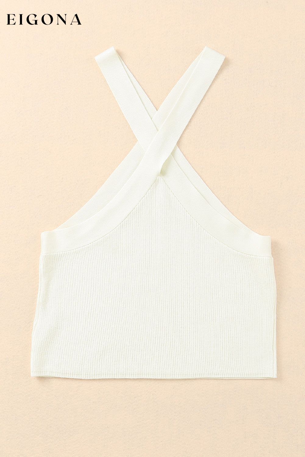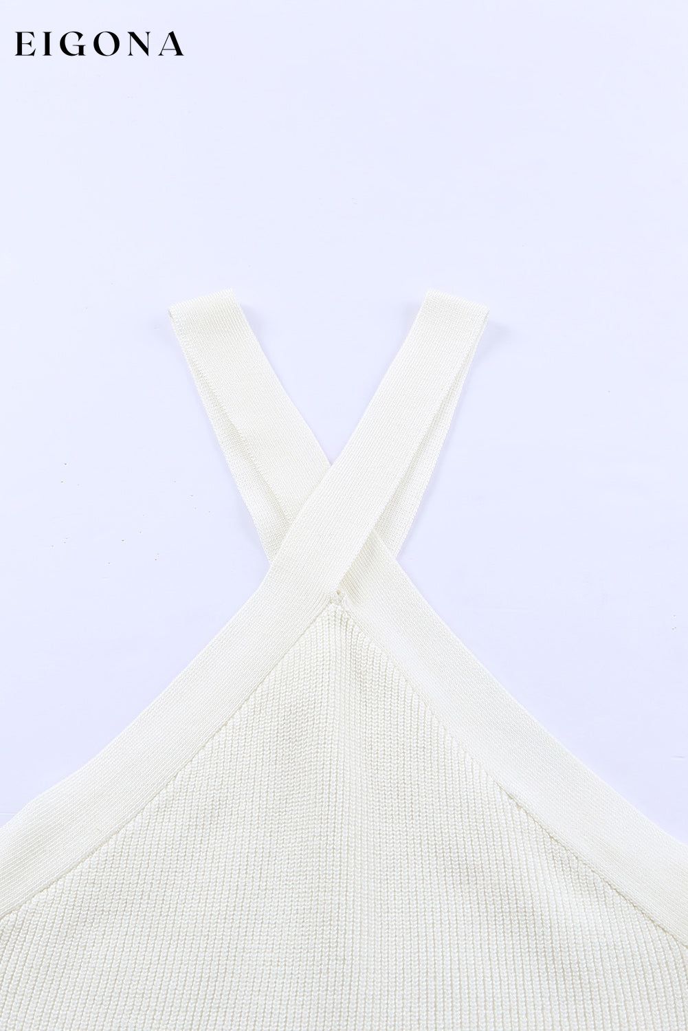 White Ribbed Knit Criss Cross Halter Neck Tank Top