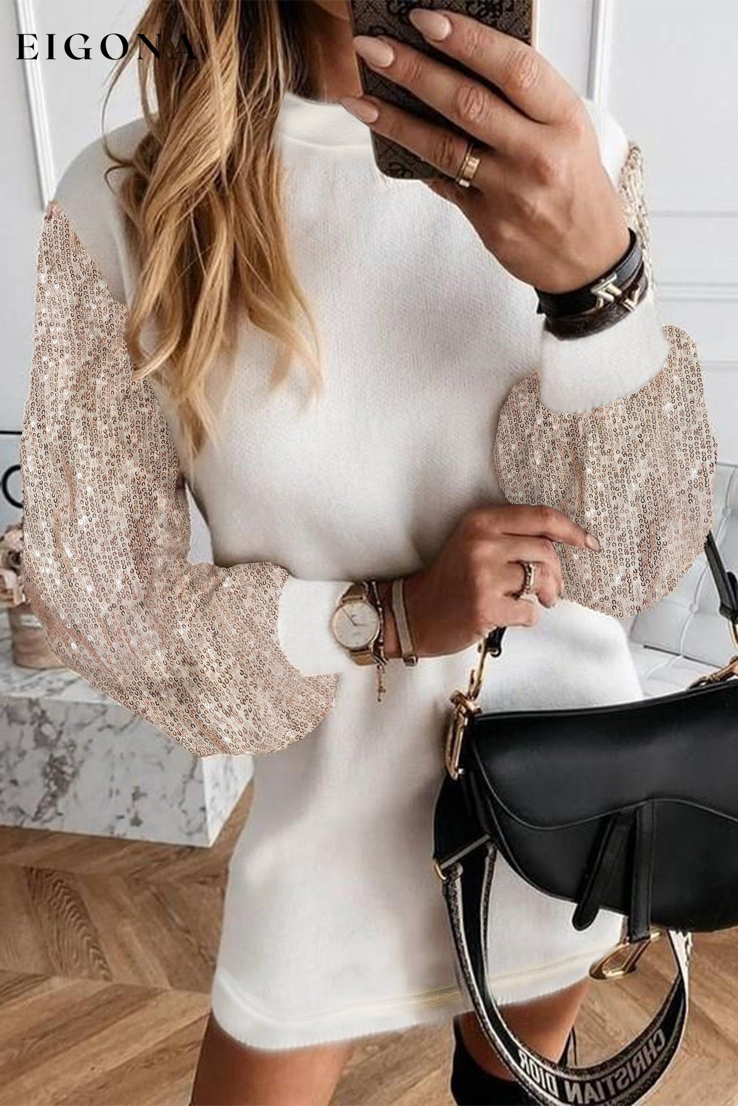 White Sequin Puff Sleeve Shift Mini Long Sleeve Sweater Dress