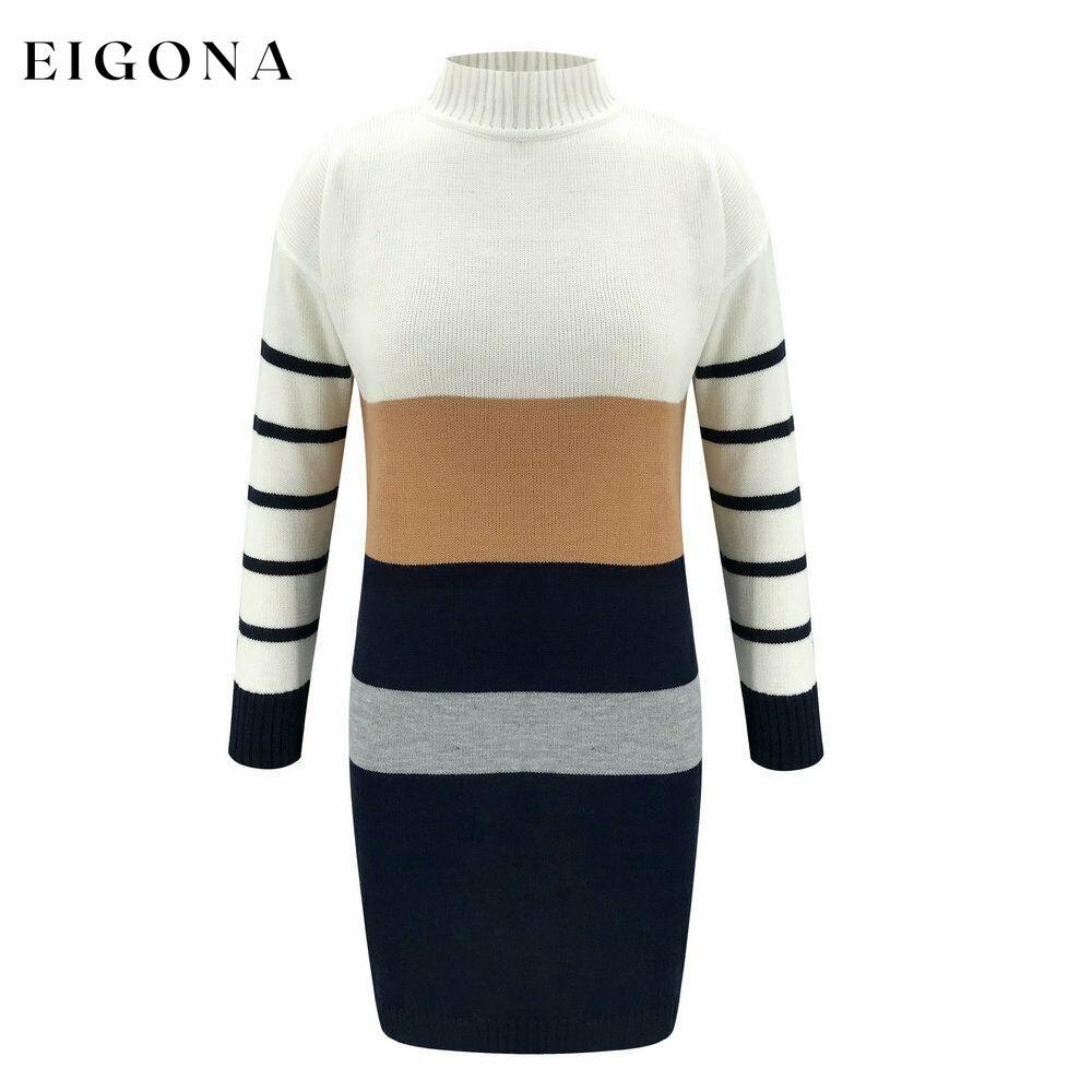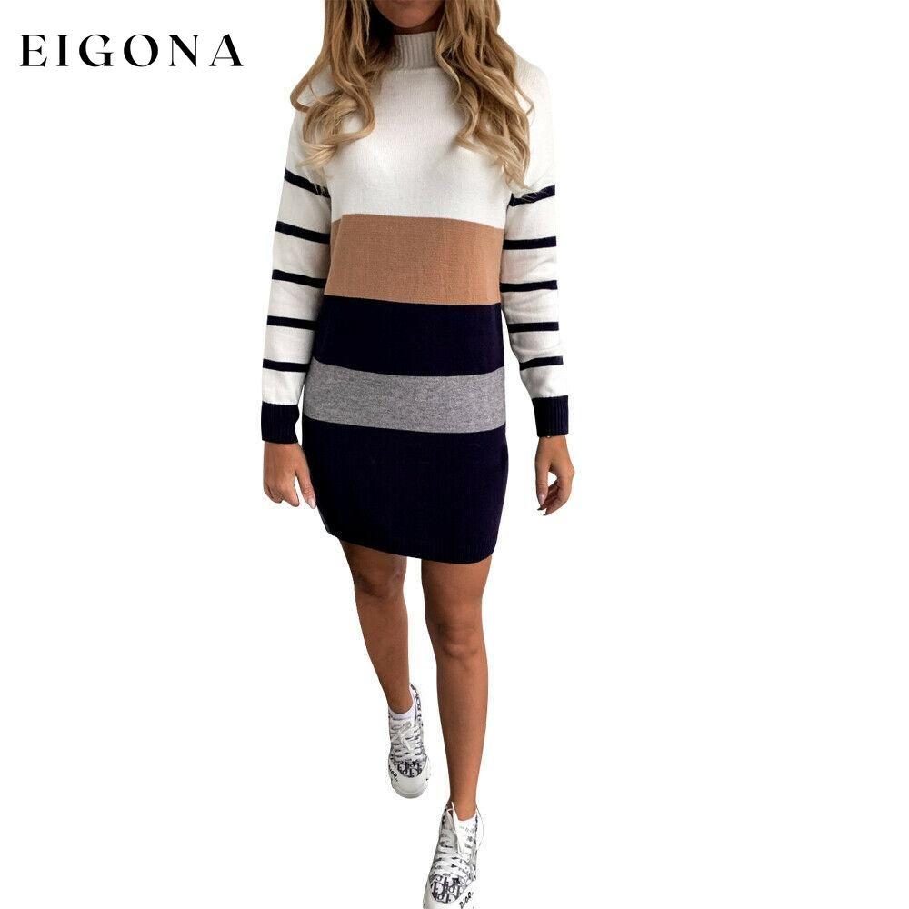 Women Knit Cowl Turtleneck Stripe Sweater Dress Long Sleeve Pullover Mini Dress.