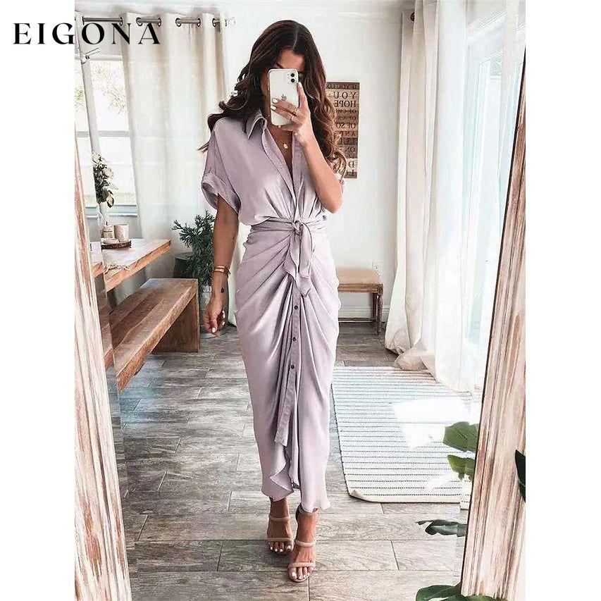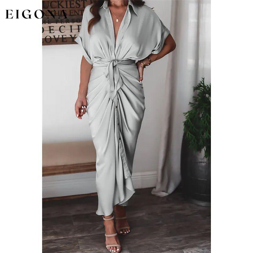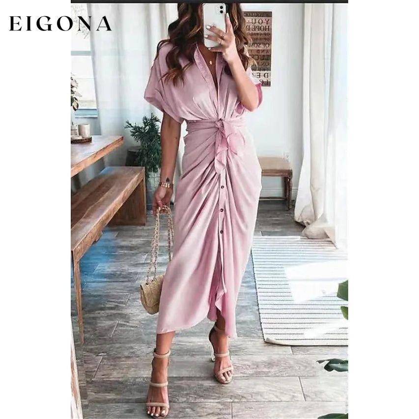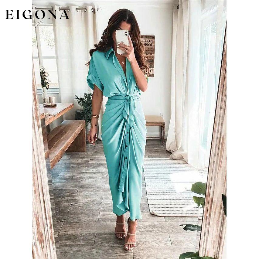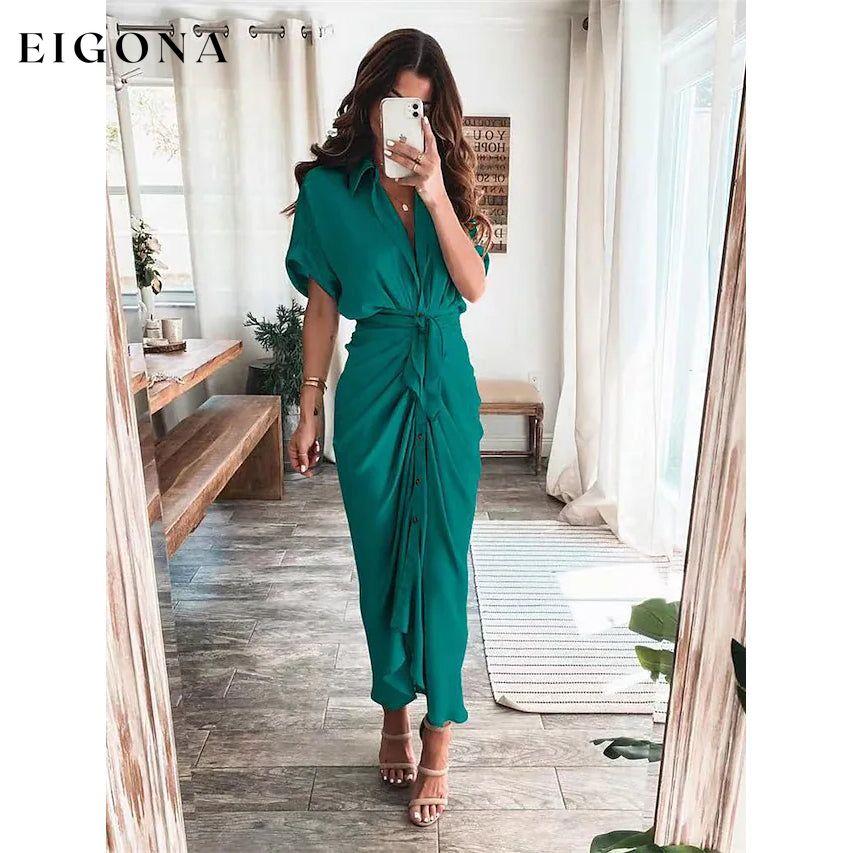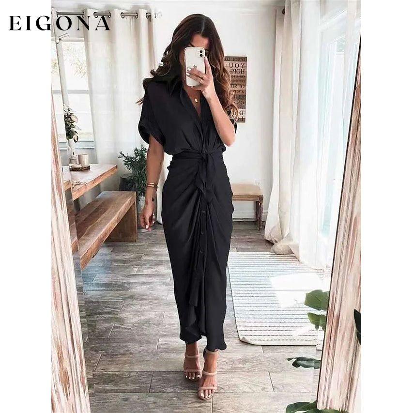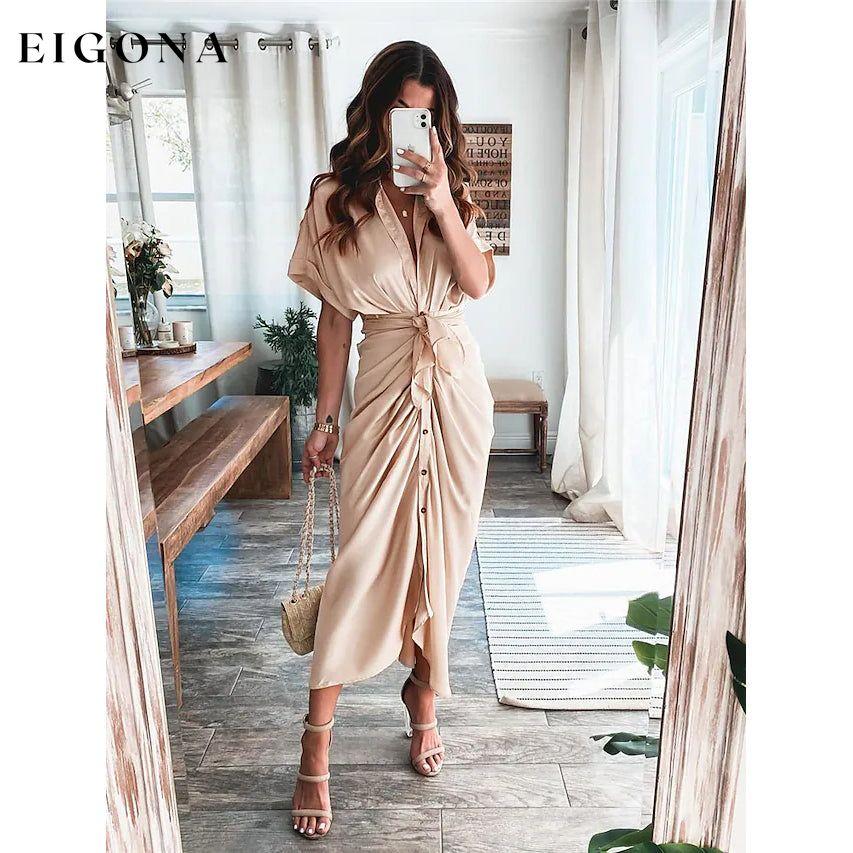 Women's Shirt Dress Maxi long Dress Short Sleeve Solid Color Ruched Lace up Button Fall Spring Shirt Collar Elegant Casual Party.