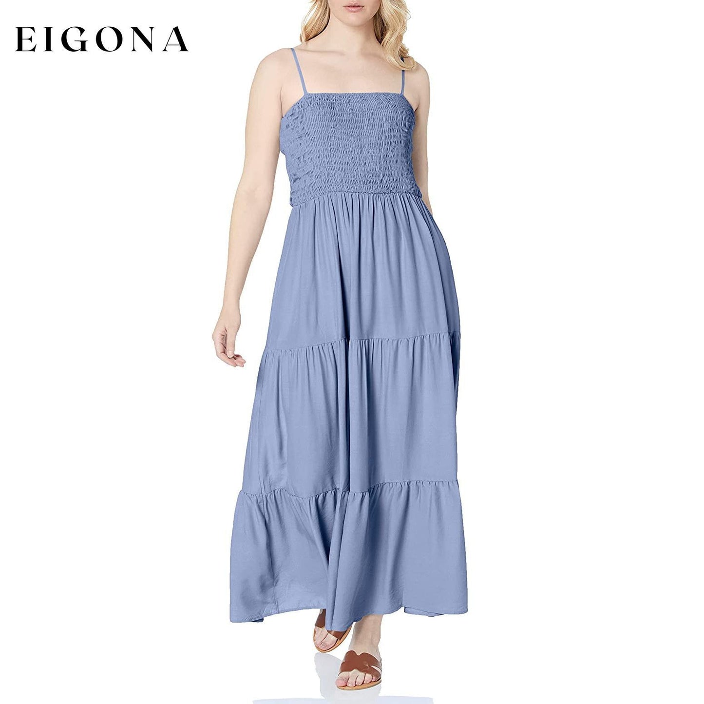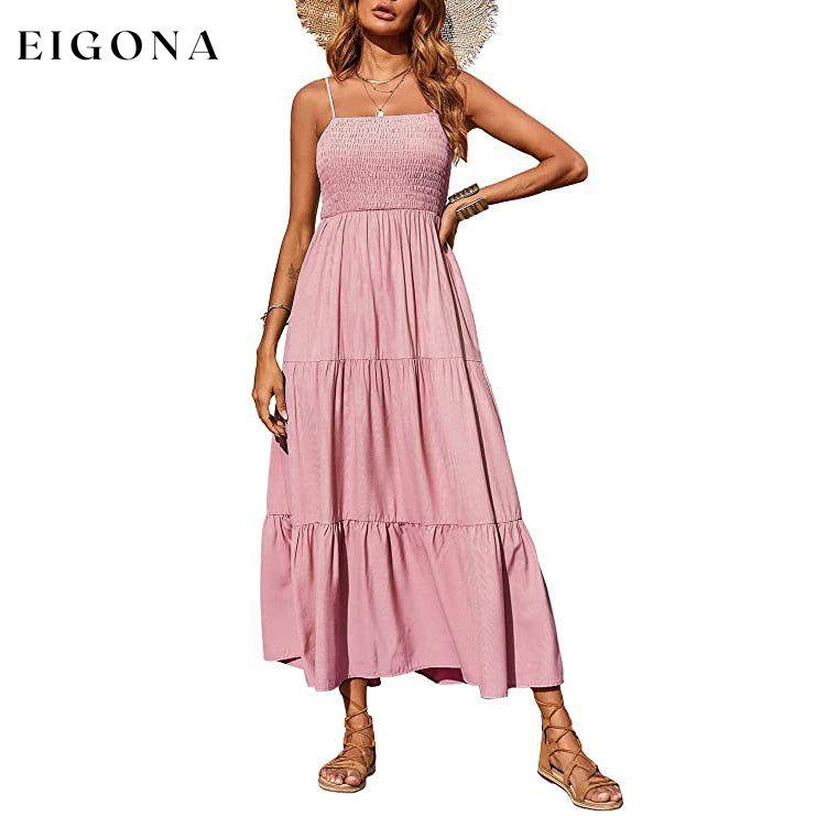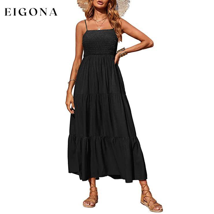 - Good as vacation dresses for women beach with adjustable spaghetti strap, cami sun dress, shirred stretchy bodice, solid color, stretchy elastic high waist, tiered dress, flared ruffle flowy skirts, Ankle length maxi dress, Casual boho style.