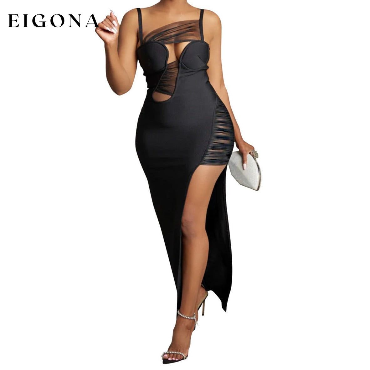Women Wear Solid Color Mesh Hollow Out Cutout Bandage Maxi Dress
