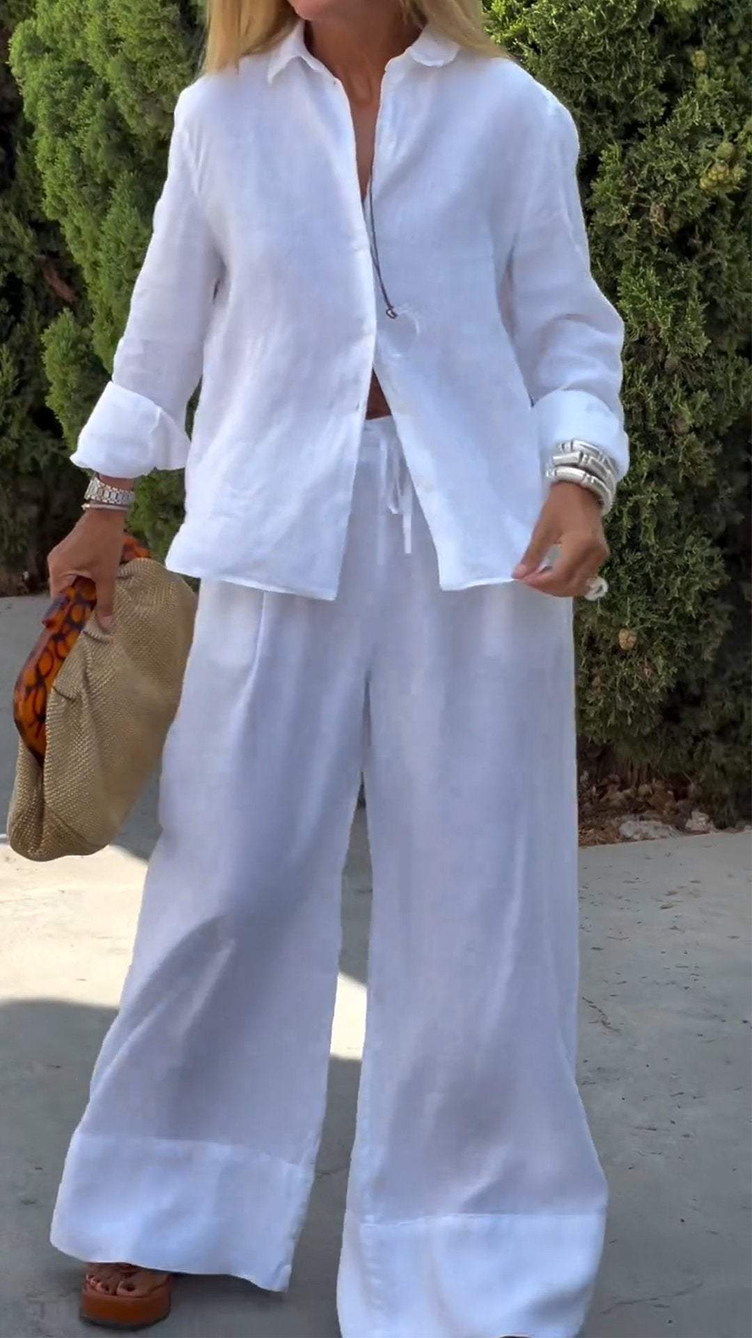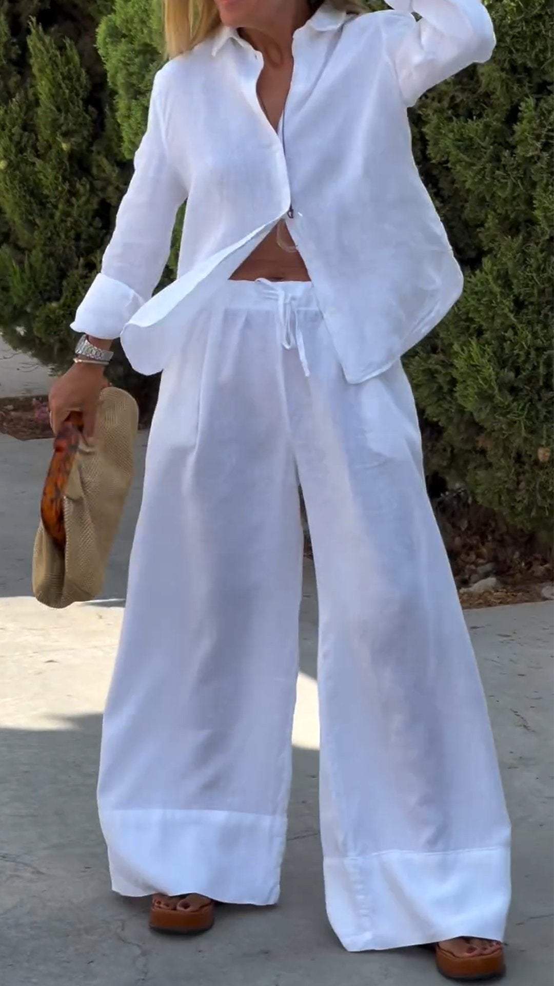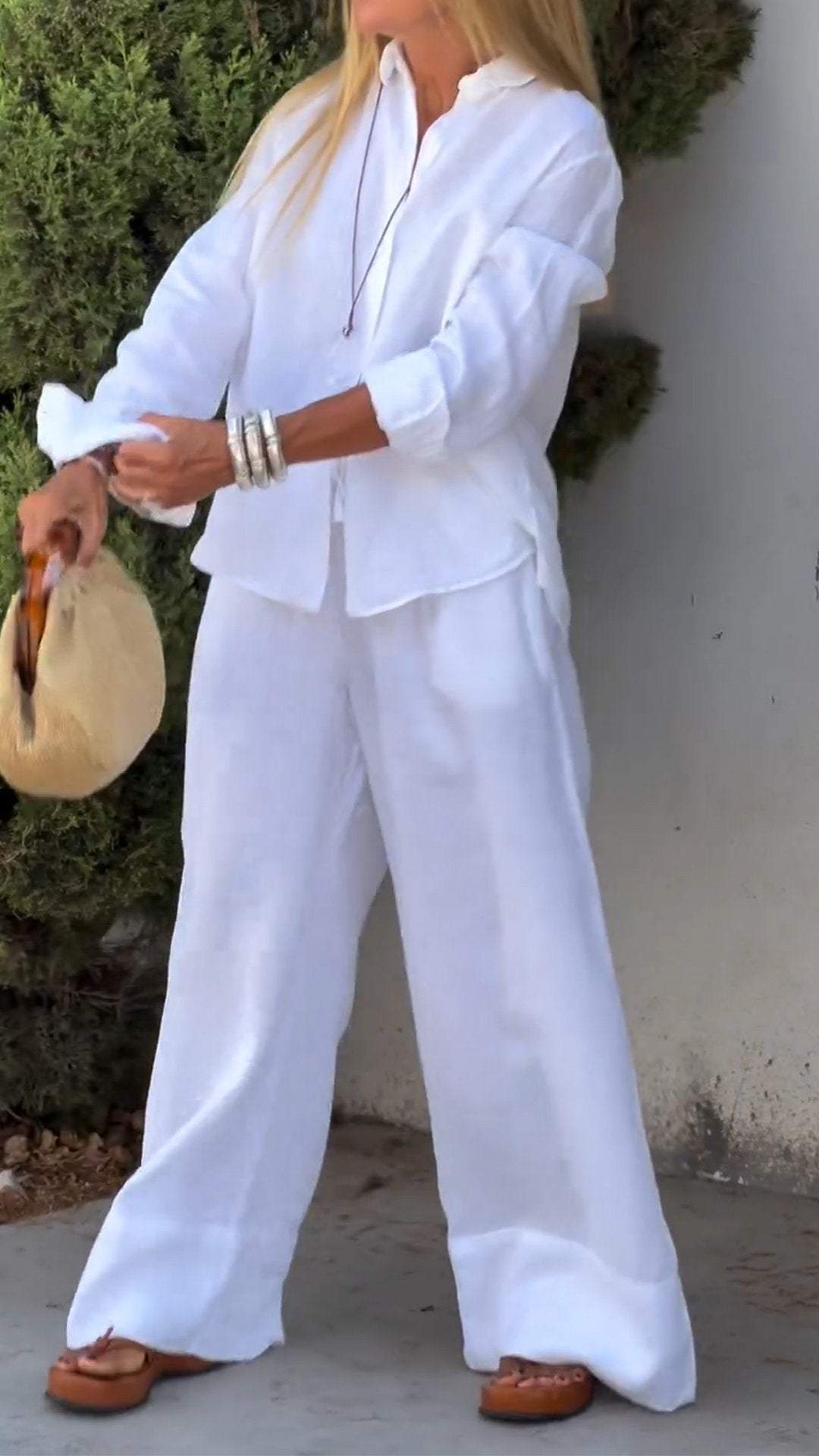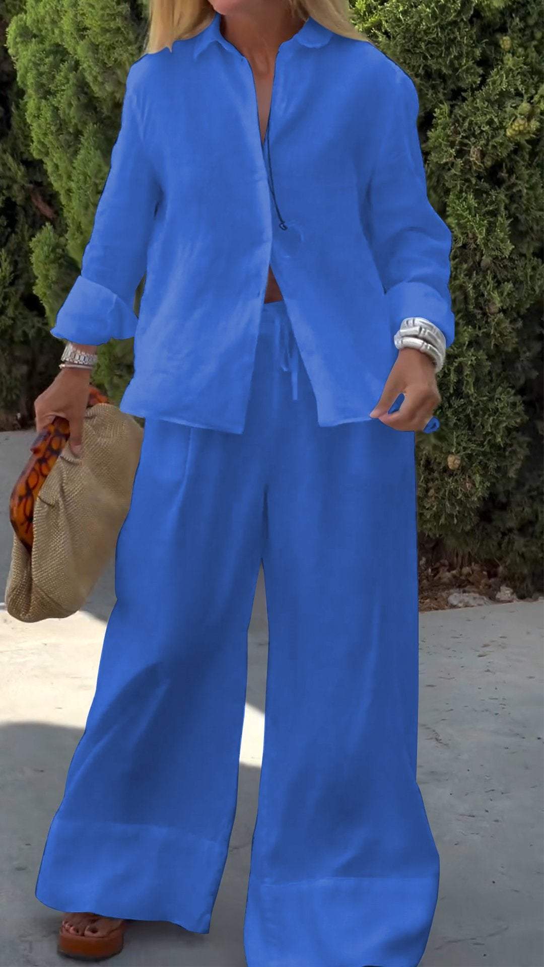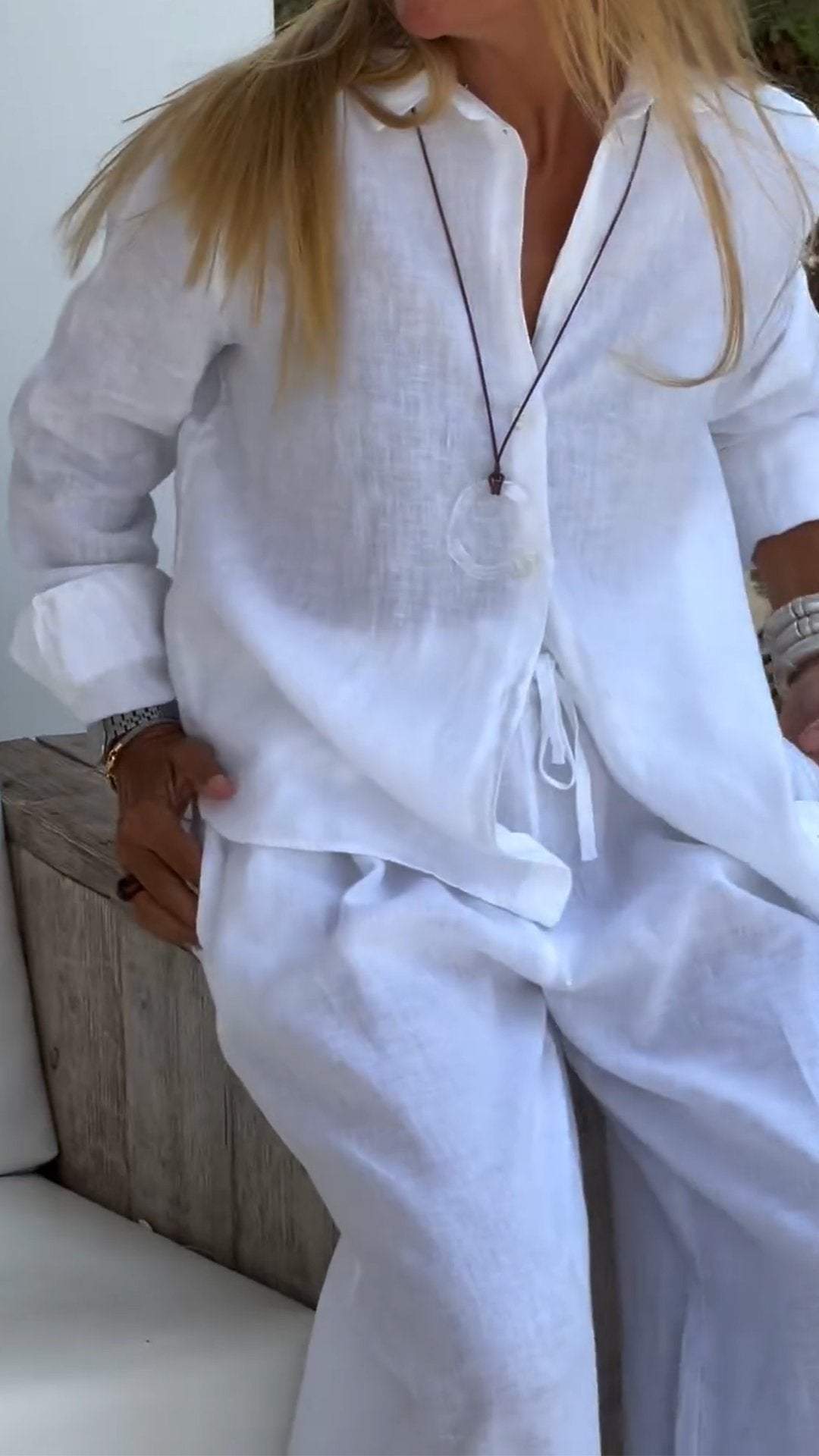 Women's Casual Solid Color Cotton and Linen Long-sleeved Two-piece Suit