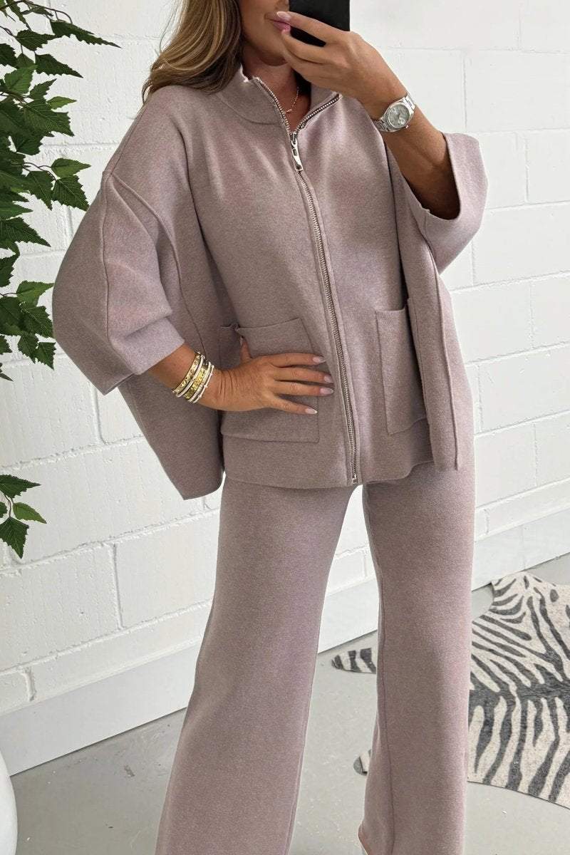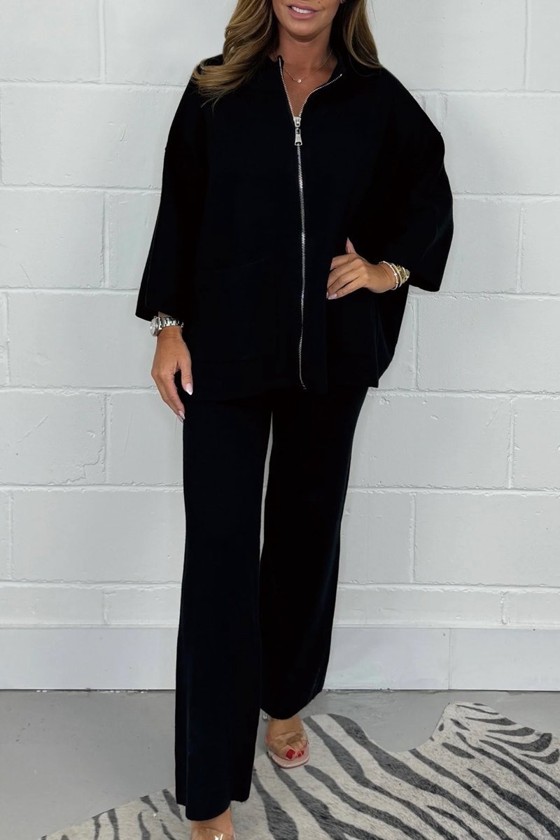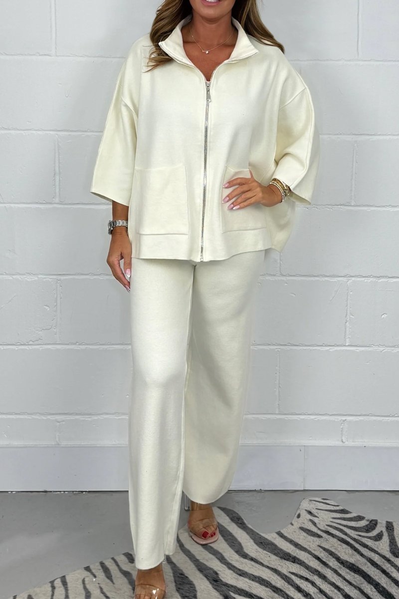 Women's Soft Knit Zip Up 3/4 Sleeve Wide Leg Trouser Co-ord
