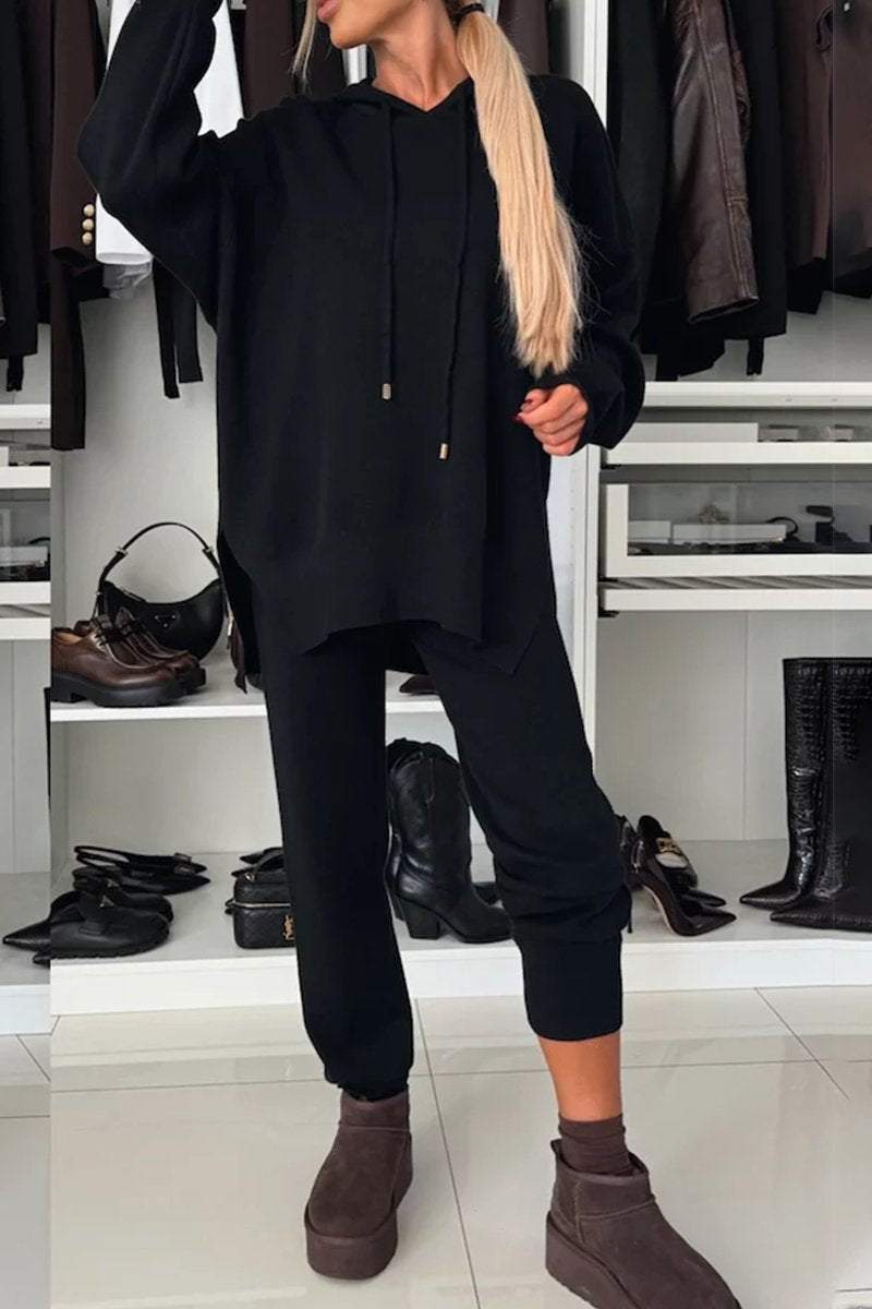 Women's Solid Color Casual Loose Hooded Side Open Hoodie Set