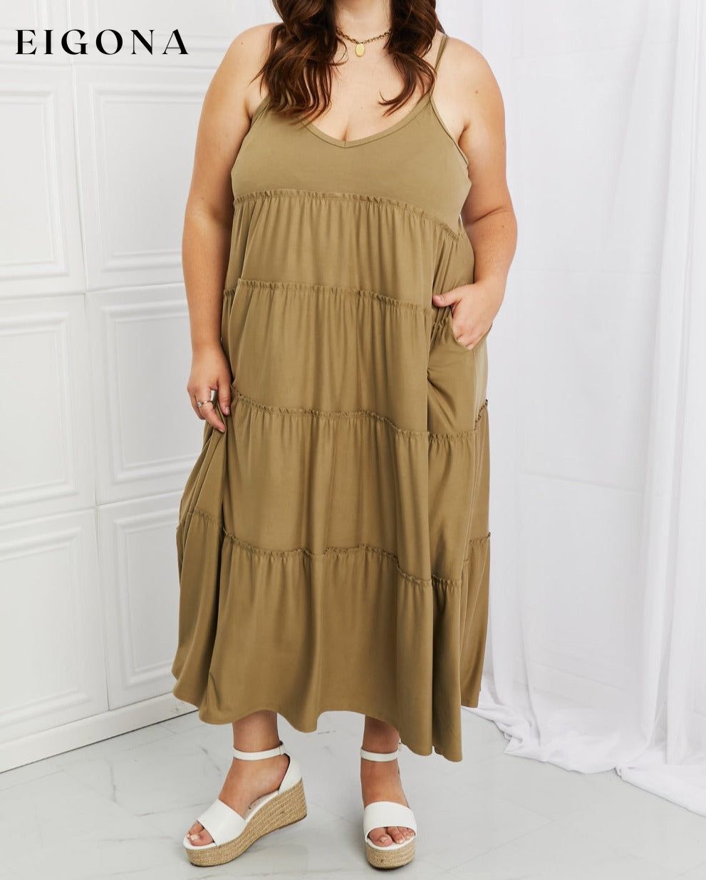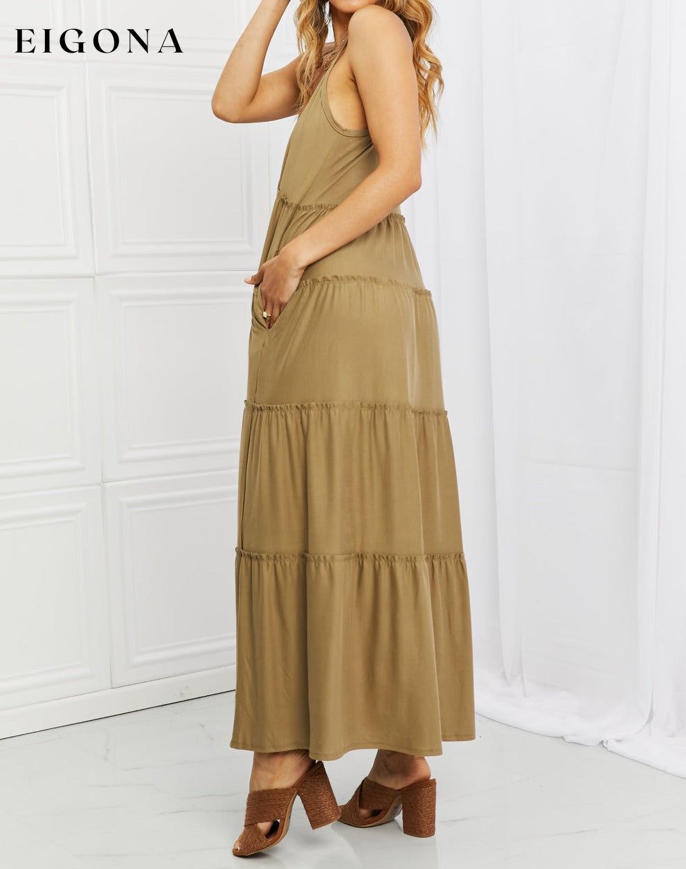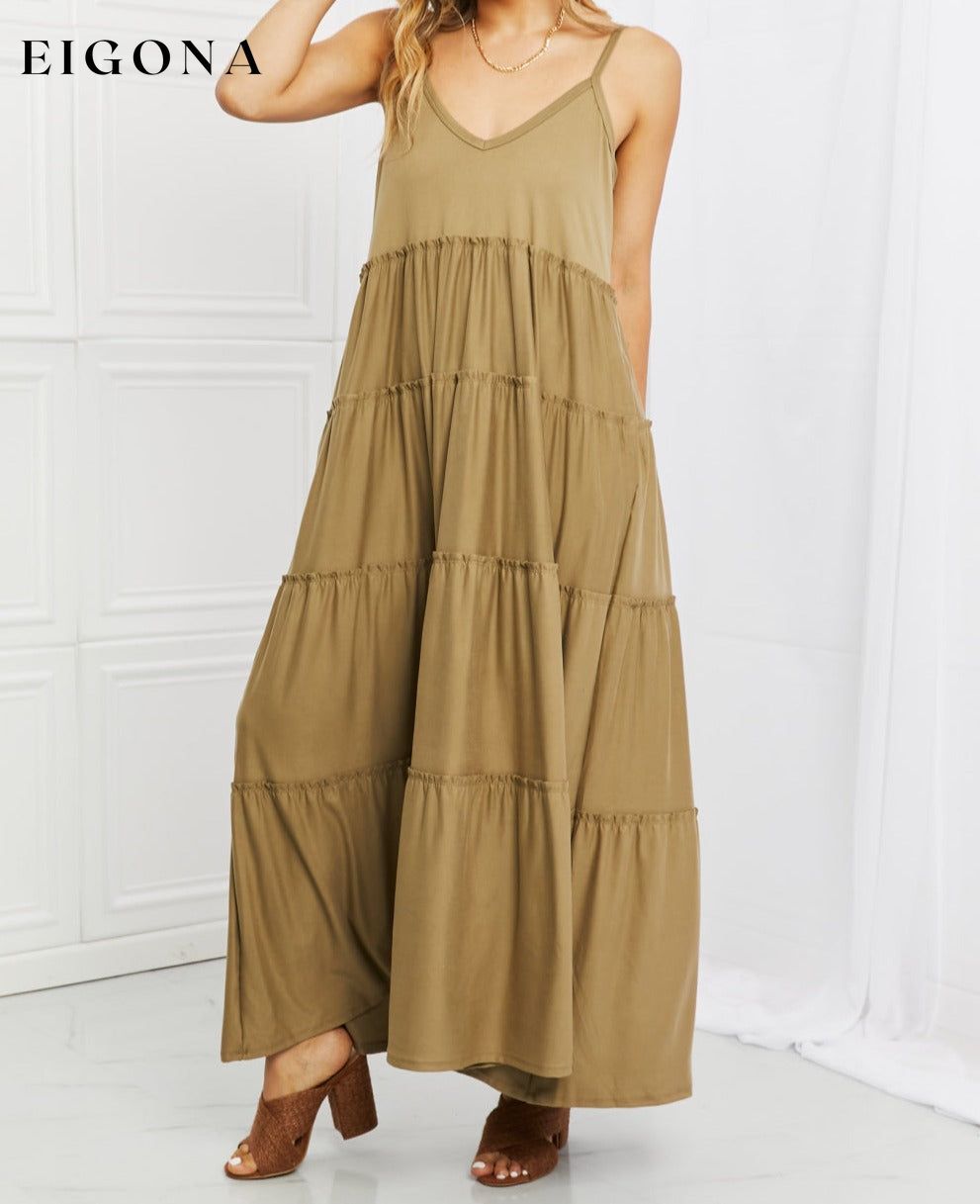 Full Size Spaghetti Strap Tiered Dress with Pockets in Khaki