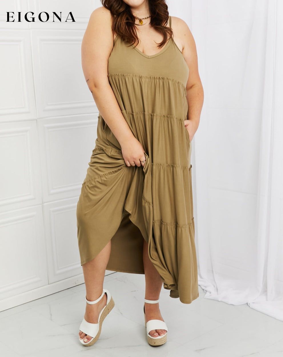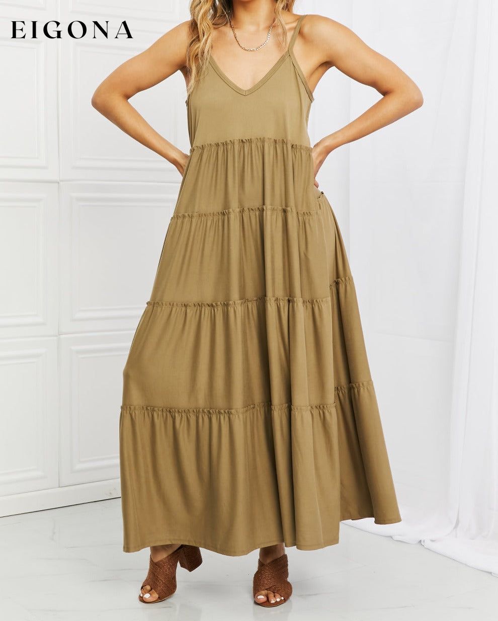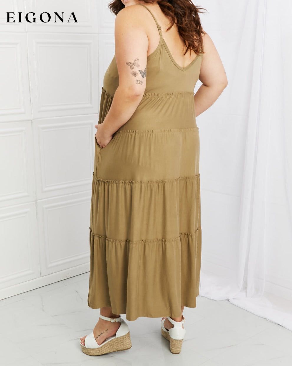 Full Size Spaghetti Strap Tiered Dress with Pockets in Khaki