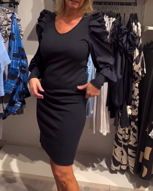 V-Neck Puff Sleeve Fitted Dress