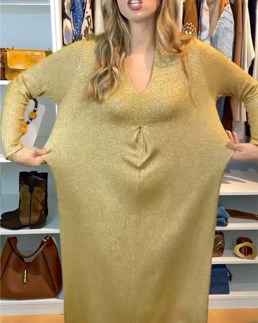 V-neck solid color glitter pleated dress