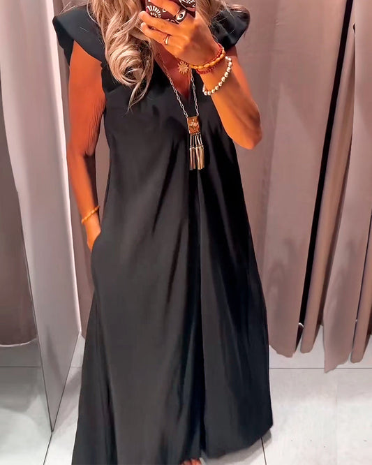 Hollow Out V-Neck Solid Color Ruffle Dress